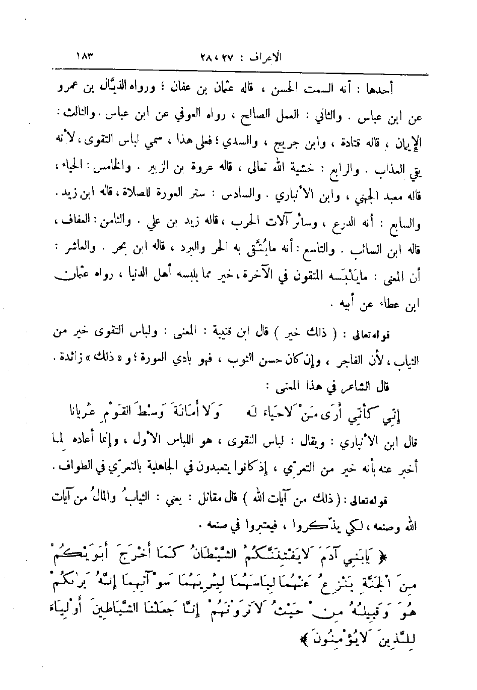 قال ابن الانباري ويقال لباس التقوى هو اللباس الأول وإنما أعاده لما أخبر عنه بأنه خير من التعري إذ كانوا يتعبدون في الجاهلية بالتعري في الطواف