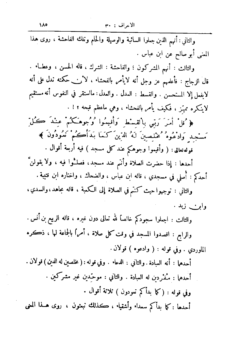 والثالث أنهم المشركون والفاحشة الشرك قاله الحسن وعطاء قال الزجاج فأعلمهم عز و جل أنه لا يأمر بالفحشاء لأن حكمته تدل على أنه لا يفعل إلا المستحسن والقسط العدل والعدل ما استقر في النفوس أنه مستقيم لا ينكره مميز فكيف يأمر بالفحشاء وهي ما عظم قبحه