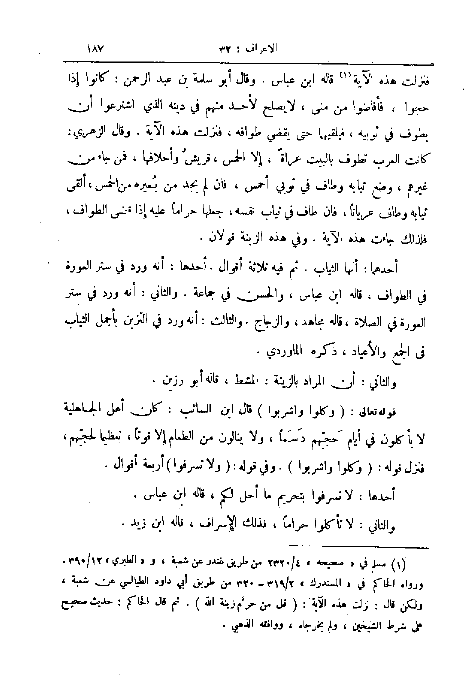 فنزلت هذه الآية قاله ابن عباس وقال أبو سلمة بن عبد الرحمن كانوا إذا حجوا فأفاضوا من منى لا يصلح لأحد منهم في دينه الذي اشترعوا أن يطوف في ثوبيه فيلقيهما حتى يقضي طوافه فنزلت هذه الآية وقال الزهري كانت العرب تطوف بالبيت عراة إلا الحمس قريش وأحلافها فمن جاء من غيرهم وضع ثيابه وطاف في ثوبي أحمس فان لم يجد من يعيره من الحمس ألقى ثيابه وطاف عريانا فان طاف في ثياب نفسه جعلها حراما عليه إذا قضى الطواف فلذلك جاءت هذه الآية وفي هذه الزينة قولان