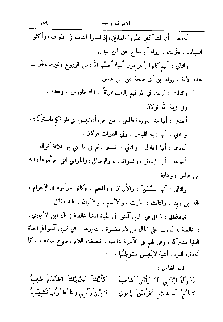 والثالث نزلت في طوافهم بالبيت عراة قاله طاووس وعطاء وفي زينة الله قولان