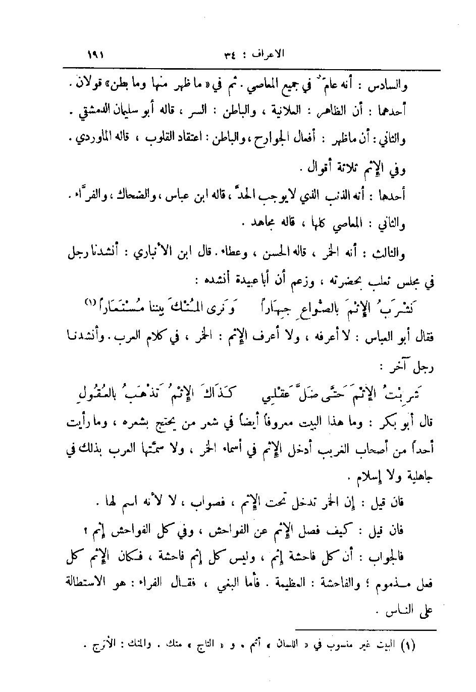 قال أبو بكر وما هذا البيت معروفا أيضا في شعر من يحتج بشعره وما رأيت أحدا من أصحاب الغريب أدخل الإثم في أسماء الخمر ولا سمتها العرب بذلك في جاهلية ولا إسلام
