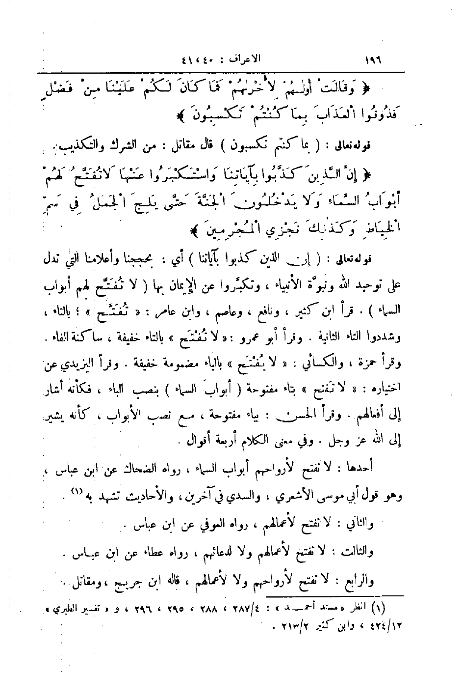قوله تعالى إن الذين كذبوا بآياتنا أي بحججنا وأعلامنا التي تدل على توحيد الله ونبوة الأنبياء وتكبروا عن الإيمان بها لا تفتح لهم ابواب السماء قرأ ابن كثير ونافع وعاصم وابن عامر تفتح بالتاء وشددوا التاء الثانية وقرأ أبو عمرو لا تفتح بالتاء خفيفة ساكنة الفاء وقرأ حمزة والكسائي لا يفتح بالياء مضمومة خفيفة وقرأ اليزيدي عن اختياره لا تفتح بتاء مفتوحة أبواب السماء بنصب الباء فكأنه أشار إلى أفعالهم وقرأ الحسن بياء مفتوحة مع نصب الأبواب كأنه يشير إلى الله عز و جل وفي معنى الكلام أربعة أقوال