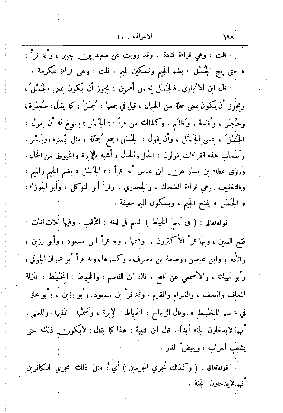 قال ابن الانباري فالجمل يحتمل أمرين يجوز أن يكون بمعنى الجمل ويجوز أن يكون بمعنى جملة من الجمال قيل في جمعها جمل كما قال حجرة وحجر وظلمة وظلم وكذلك من قرأ الجمل يسوغ له أن يقول الجمل بمعنى الجمل وأن يقول الجمل جمع جملة مثل بسرة وبسر وأصحاب هذه القراءات يقولون الحبل والحبال أشبه بالإبرة والخيوط من الجمال وروى عطاء بن يسار عن ابن عباس أنه قرأ الجمل بضم الجيم والميم وبالتخفيف وهي قراءة الضحاك والجحدري وقرأ أبو المتوكل وأبو الجوزاء الجمل بفتح الجيم وبسكون الميم خفيفة