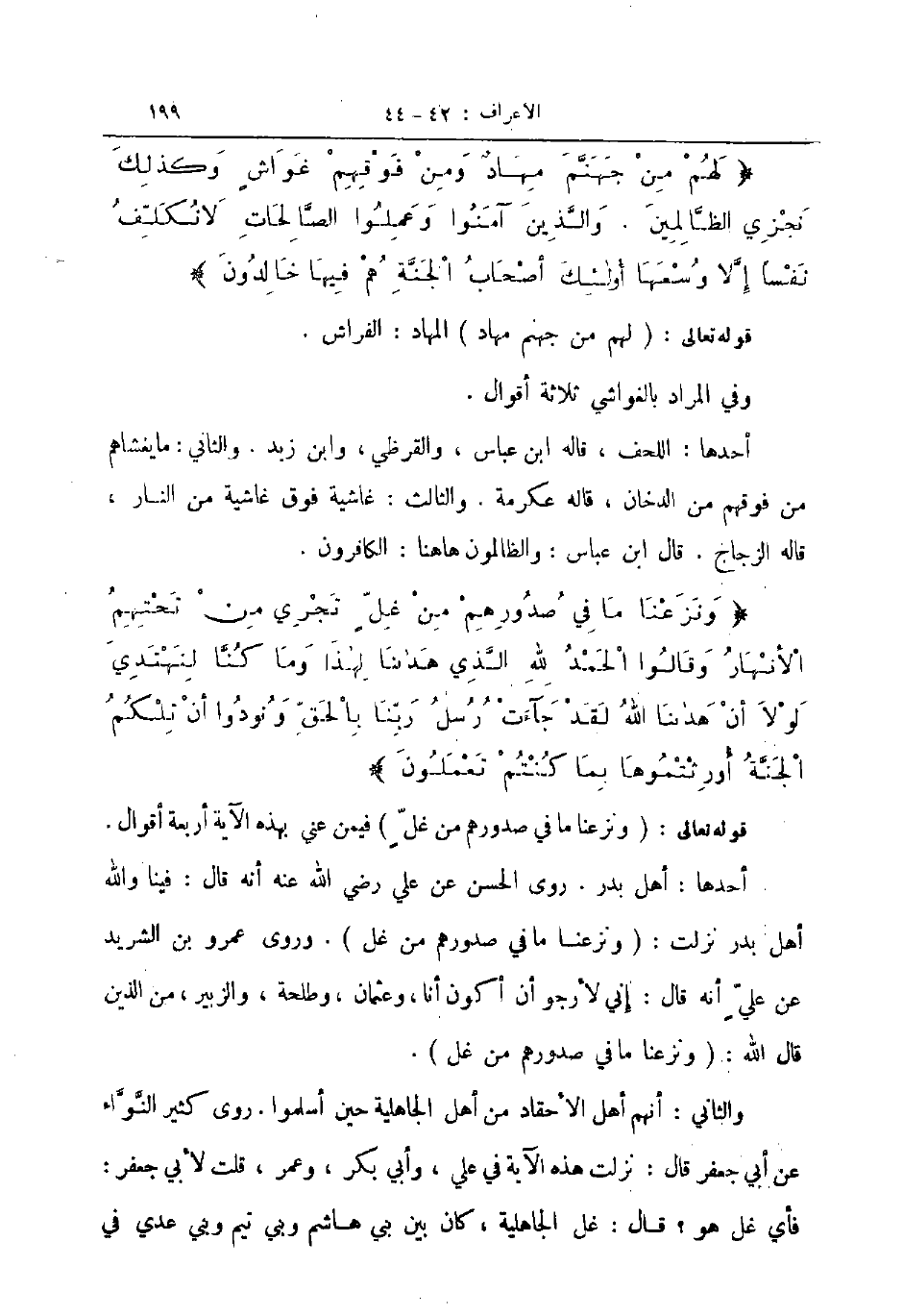 والثاني أنهم أهل الأحقاد من أهل الجاهلية حين أسلموا روى كثير النواء عن أبي جعفر قال نزلت هذه الآية في علي وأبي بكر وعمر قلت لأبي جعفر فأي غل هو قال غل الجاهلية كان بين بني هاشم وبني تيم وبني عدي في