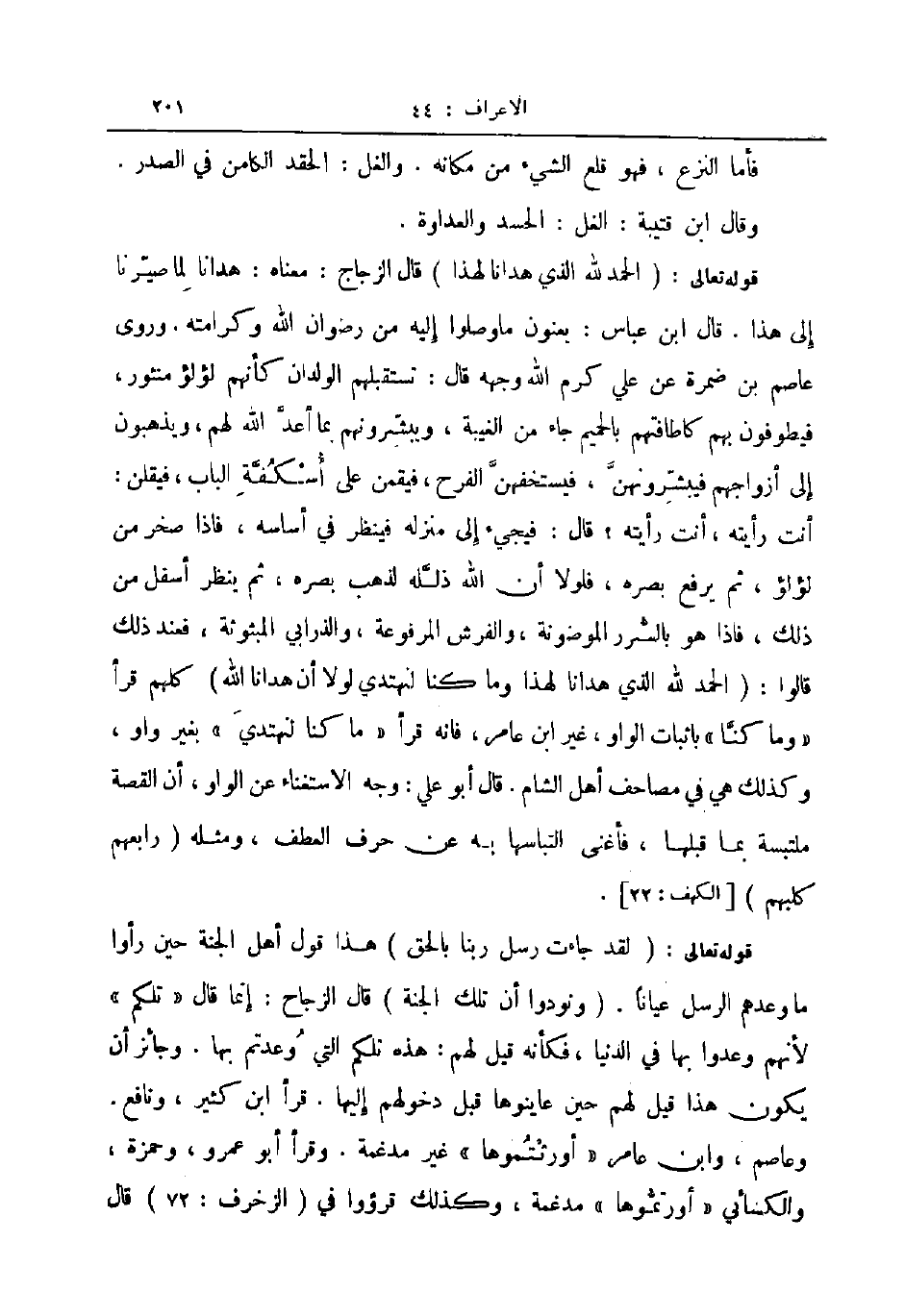 قوله تعالى الحمد لله الذي هدانا لهذا قال الزجاج معناه هدانا لما صيرنا إلى هذا قال ابن عباس يعنون ما وصلوا إليه من رضوان الله وكرامته وروى عاصم بن ضمرة عن علي كرم الله وجهه قال تستقبلهم الولدان كأنهم لؤلؤ منثور فيطوفون بهم كاطافتهم بالحميم جاء من الغيبة ويبشرونهم بما أعد الله لهم ويذهبون إلى أزواجهم فيبشرونهم فيستخفهن الفرح فيقمن على أسكفة الباب فيقلن أنت رأيته أنت رأيته قال فيجيء إلى منزله فينظر في أساسه فاذا صخر من لؤلؤ ثم يرفع بصره فلولا أن الله ذلله لذهب بصره ثم ينظر اسفل من ذلك فاذا هو بالسرر الموضونة والفرش المرفوعة والذرابي المبثوثة فعند ذلك قالوا الحمد لله الذي هدانا لهذا وما كنا لنهتدي لولا أن هدانا الله كلهم قرأ وما كنا باثبات الواو غير ابن عامر فانه قرأ ما كنا لنهتدي بغير واو وكذلك هي في مصاحف أهل الشام قال أبو علي وجه الاستغناء عن الواو أن القصة ملتبسة بما قبلها فأغنى التباسها به عن حرف العطف ومثله رابعهم كلبهم