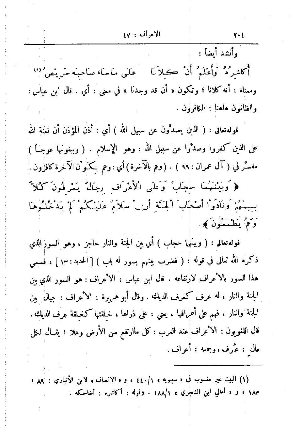 قوله تعالى وبينهما حجاب أي بين الجنة والنار حاجز وهو السور الذي ذكره الله تعالى في قوله فضرب بينهم بسور له باب فسمي هذا السور بالأعراف لارتفاعه قال ابن عباس الأعراف هو السور الذي بين الجنة والنار له عرف كعرف الديك وقال أبو هريرة الأعراف جبال بين الجنة والنار فهم على أعرافها يعني على ذراها خلقتها كخلقة عرف الديك قال اللغويون الأعراف عند العرب كل ما ارتفع من الأرض وعلا يقال لكل عال عرف وجمعه أعراف