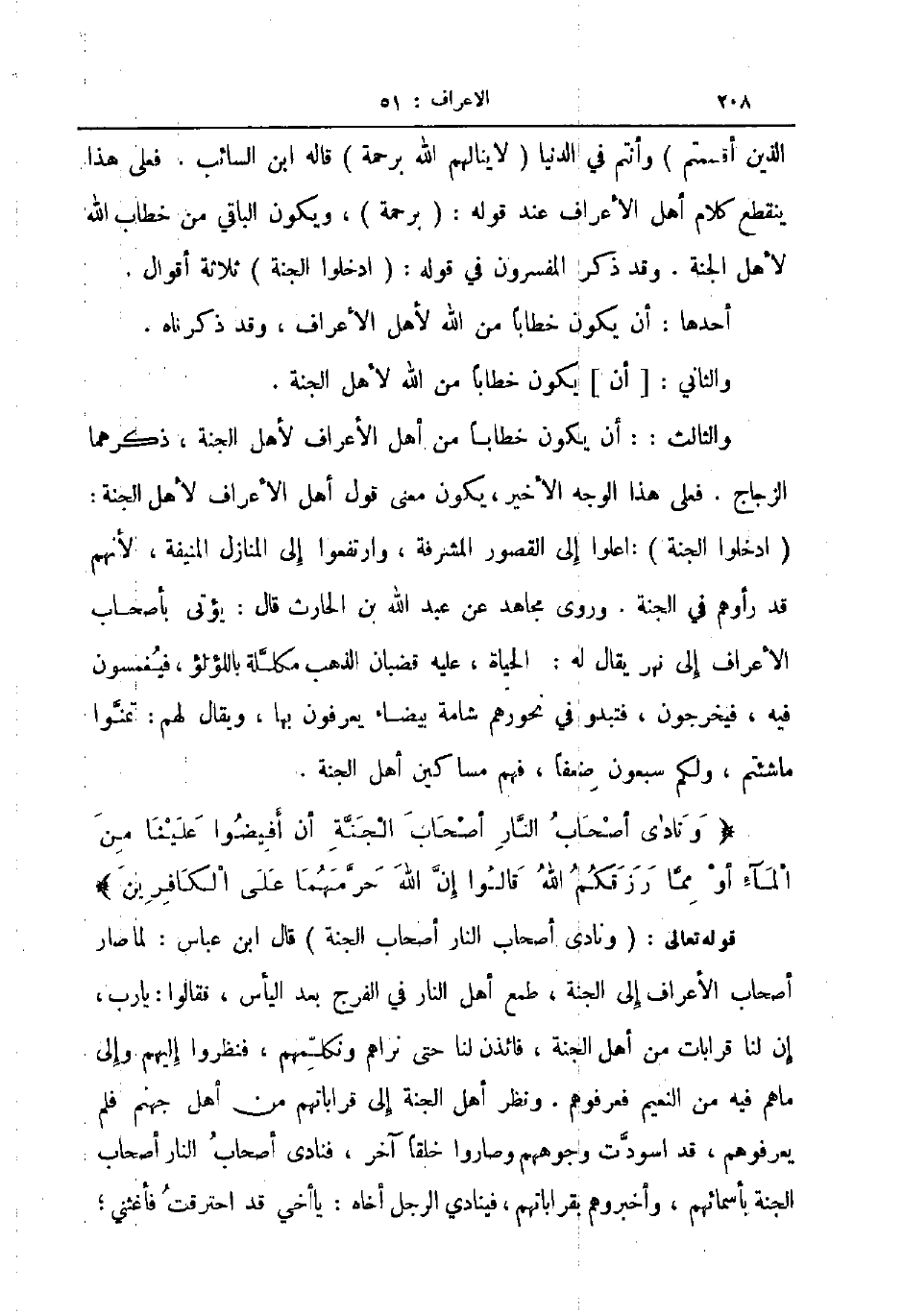والثالث أن يكون خطابا من أهل الأعراف لأهل الجنة ذكرهما الزجاج فعلى هذا الوجه الأخير يكون معنى قول أهل الأعراف لأهل الجنة ادخلوا الجنة اعلوا إلى القصور المشرفة وارتفعوا إلى المنازل المنيفة لأنهم قد رأوهم في الجنة وروى مجاهد عن عبد الله بن الحارث قال يؤتى بأصحاب الأعراف إلى نهر يقال له الحياة عليه قضبان الذهب مكللة باللؤلؤ فيغمسون فيه فيخرجون فتبدو في نحورهم شامة بيضاء يعرفون بها ويقال لهم تمنوا ما شئتم ولكم سبعون ضعفا فهم مساكين أهل الجنة