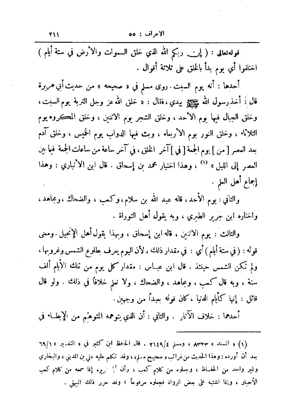 والثالث يوم الاثنين قاله ابن إسحاق وبهذا يقول أهل الإنجيل ومعنى قوله في ستة ايام أي في مقدار ذلك لأن اليوم يعرف بطلوع الشمس وغروبها ولم تكن الشمسي حينئذ قال ابن عباس مقدار كل يوم من تلك الأيام ألف سنة وبه قال كعب ومجاهد والضحاك ولا نعلم خلافا في ذلك ولو قال قائل إنها كأيام الدنيا كان قوله بعيدا من وجهين