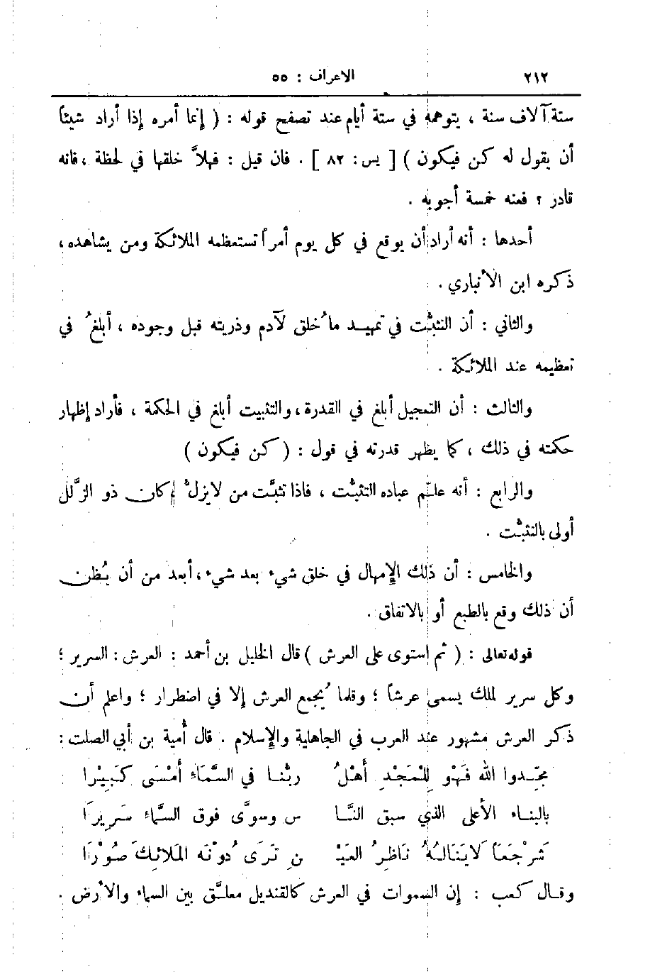 قوله تعالى ثم استوى على العرش قال الخليل بن أحمد العرش السرير وكل سرير لملك يسمى عرشا وقلما يجمع العرش إلا في اضطرار واعلم أن ذكر العرش مشهور عند العرب في الجاهلية والإسلام قال أمية بن أبي الصلت ... مجدوا الله فهو للمجد أهل ... ربنا في السماء أمسى كبيرا ... بالبناء الأعلى الذي سبق الناس ... وسوى فوق السماء سريرا ... شرجعا لا يناله ناظر العي ... ن ترى دونه الملائك صورا ...