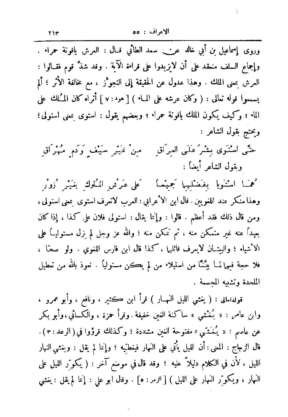 وهذا منكر عند اللغويين قال ابن الاعرابي العرب لا تعرف استوى بمعنى استولى ومن قال ذلك فقد أعظم قالوا وإنما يقال استولى فلان على كذا إذا كان بعيدا عنه غير متمكن منه ثم تمكن منه والله عز و جل لم يزل مستوليا على الأشياء والبيتان لا يعرف قائلهما كذا قال ابن فارس اللغوي ولو صحا فلا حجة فيهما لما بينا من استيلاء من لم يكن مستوليا نعوذ بالله من تعطيل الملحدة وتشبيه المجسمة