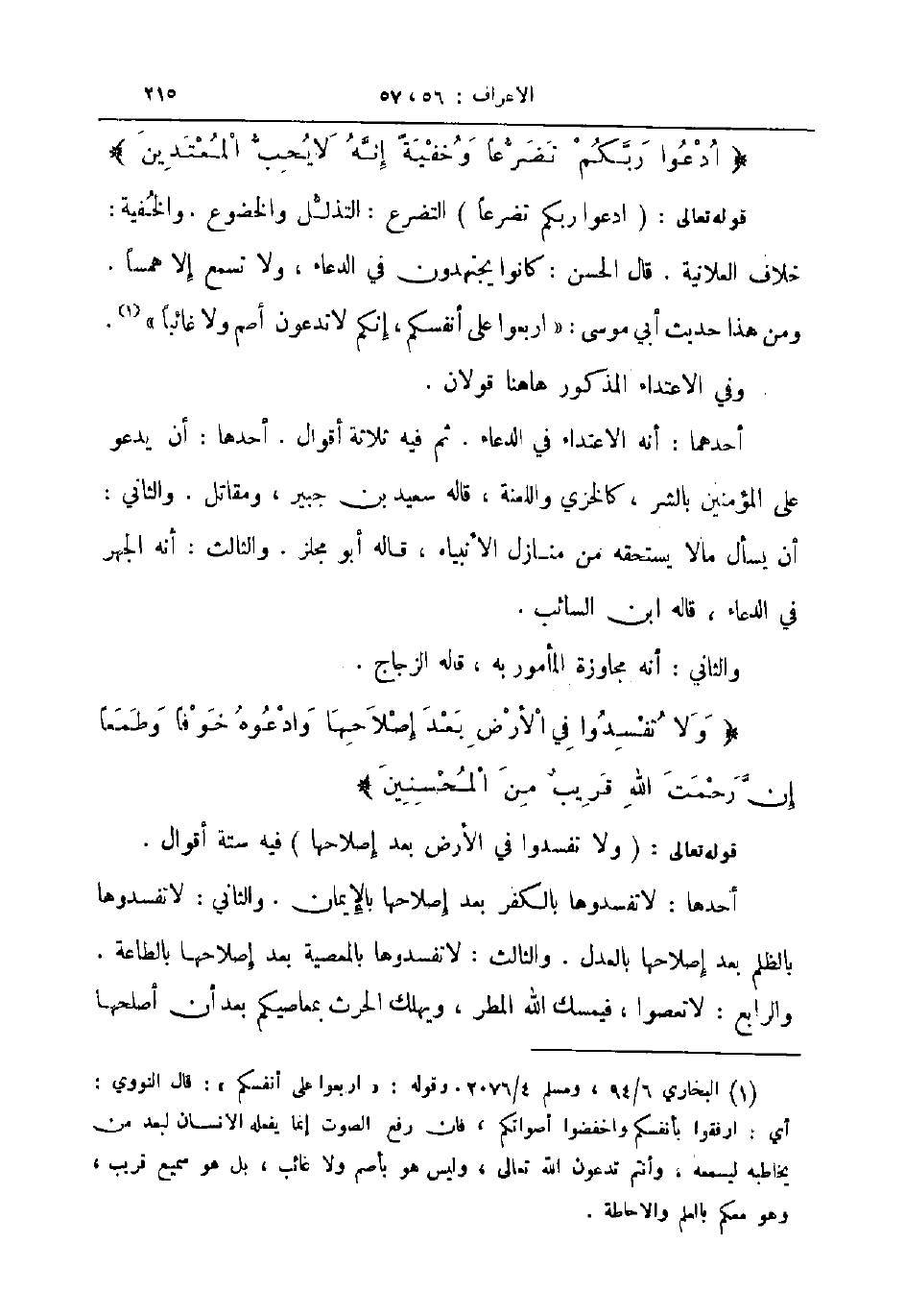 قوله تعالى ادعوا ربكم تضرعا التضرع التذلل والخضوع والخفية خلاف العلانية قال الحسن كانوا يجتهدون في الدعاء ولا تسمع إلا همسا ومن هذا حديث أبي موسى اربعوا على أنفسكم إنكم لا تدعون أصم ولا غائبا وفي الاعتداء المذكور هاهنا قولان