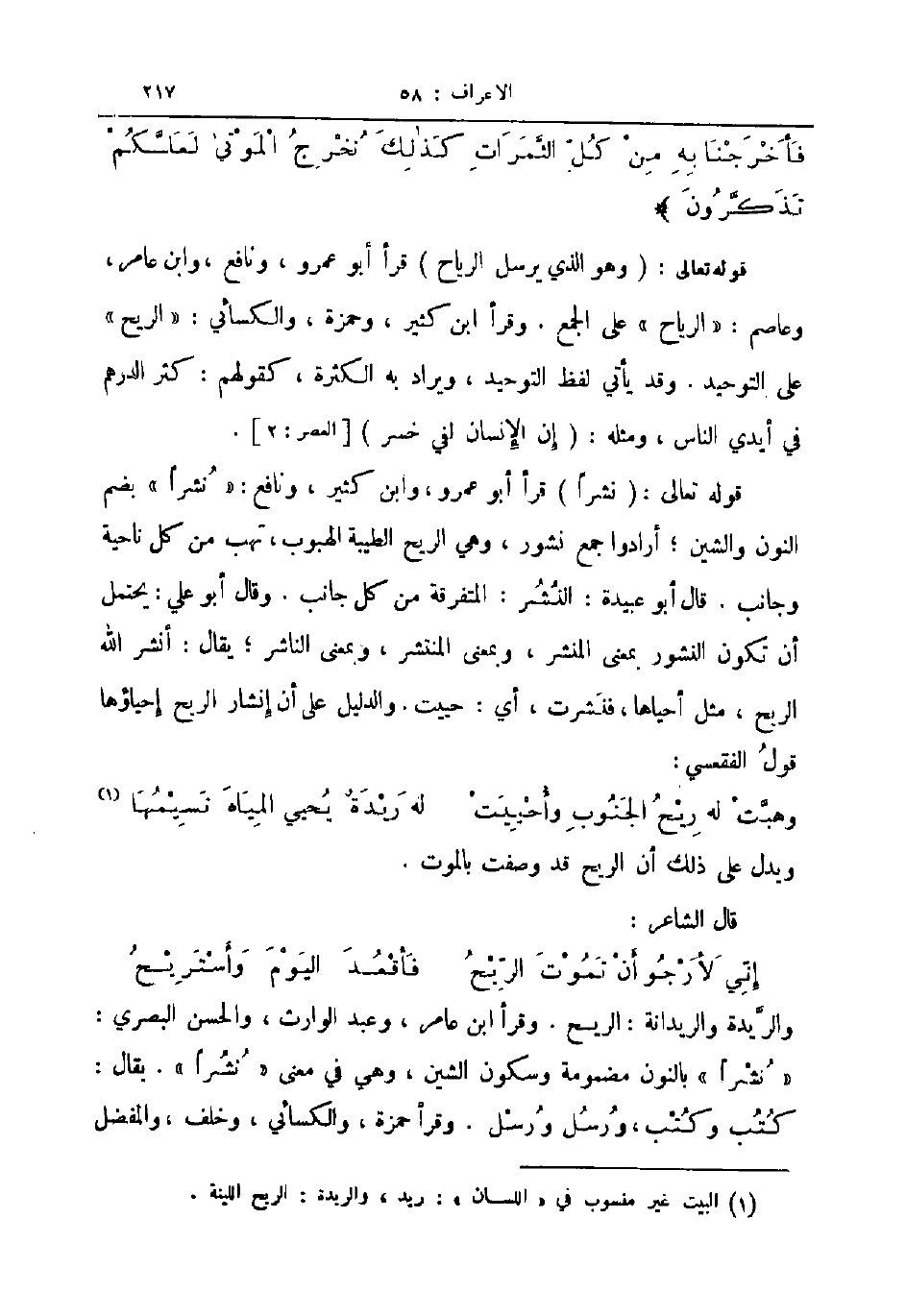 قوله تعالى وهو الذي يرسل الرياح قرأ أبو عمرو ونافع وابن عامر وعاصم الرياح على الجمع وقرأ ابن كثير وحمزة والكسائي الريح على التوحيد وقد يأتي لفظ التوحيد ويراد به الكثرة كقولهم كثر الدرهم في أيدي الناس ومثله إن الإنسان لفي خسر