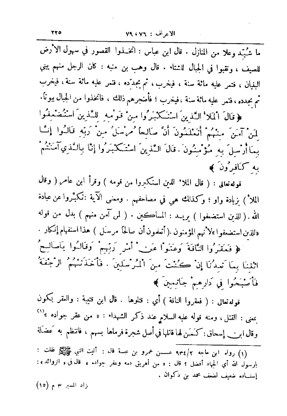 ما شيد وعلا من المنازل قال ابن عباس اتخذوا القصور في سهول الأرض للصيف وثقبوا في الجبال للشتاء قال وهب بن منبه كان الرجل منهم يبني البنيان فتمر عليه مائة سنة فيخرب ثم يجدده فتمر عليه مائة سنة فيخرب ثم يجدده فتمر عليه مائة سنة فيخرب فأضجرهم ذلك فأخذوا من الجبال بيوتا