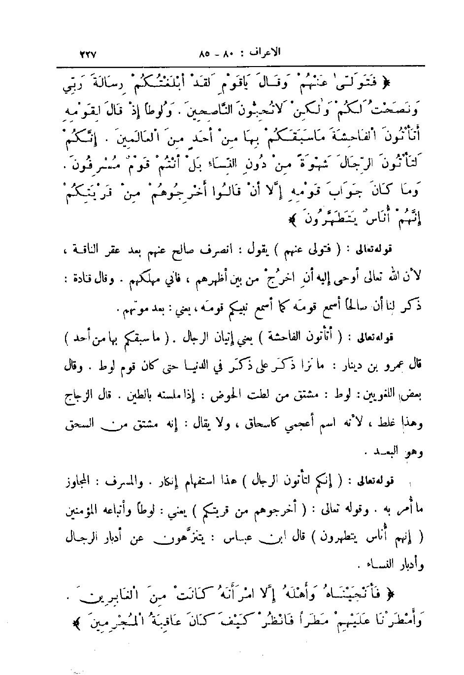 فتولى عنهم وقال يا قوم لقد أبلغتكم رسالة ربي ونصحت لكم ولكن لا تحبون الناصحين ولوطا إذ قال لقومه أتأتون الفاحشة ما سبقكم بها من أحد من العالمين إنكم لتأتون الرجال شهوة دون النساء بل أنتم قوم مسرفون وما كان جواب قومه إلا أن قالوا أخرجوهم من قريتكم إنهم أناس يتطهرون