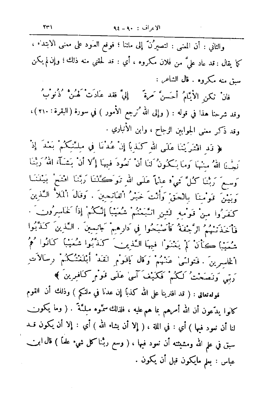 قد افترينا على الله كذبا إن عدنا في ملتكم بعد إذ نجانا الله منها وما يكون لنا أن نعود فيها إلا أن يشاء الله ربنا وسع ربنا كل شيء علما على الله توكلنا ربنا افتح بيننا وبين قومنا بالحق وأنت خير الفاتحين وقال الملأ الذين كفروا من قومه لئن اتبعتم شعيبا إنكم إذا لخاسرون فأخذتهم الرجفة فأصبحوا في دارهم جاثمين الذين كذبوا شعيبا كأن لم يغنوا فيها الذين كذبوا شعيبا كانوا هم الخاسرين فتولى عنهم وقال يا قوم لقد أبلغتكم رسالات ربي ونصحت لكم فكيف آسى على قوم كافرين