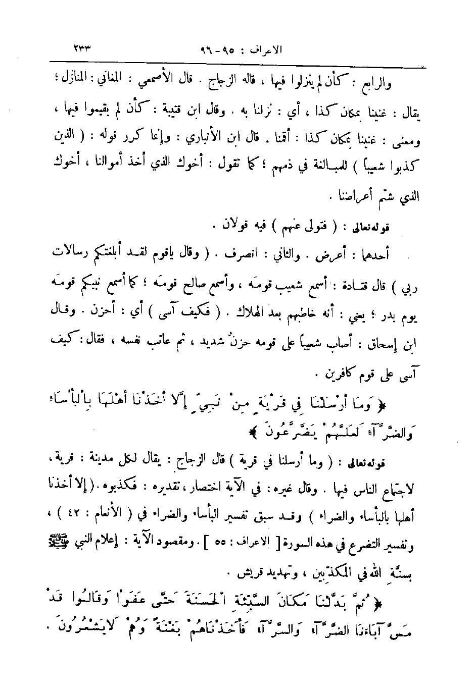 قوله تعالى وما أرسلنا في قرية قال الزجاج يقال لكل مدينة قرية لاجتماع الناس فيها وقال غيره في الآية اختصار تقديره فكذبوه إلا أخذنا أهلها بالبأساء والضراء وقد سبق تفسير البأساء والضراء في الأنعام وتفسير التضرع في هذه السورة ومقصود الآية إعلام النبي صلى الله عليه و سلم بسنة الله في المكذبين وتهديد قريش