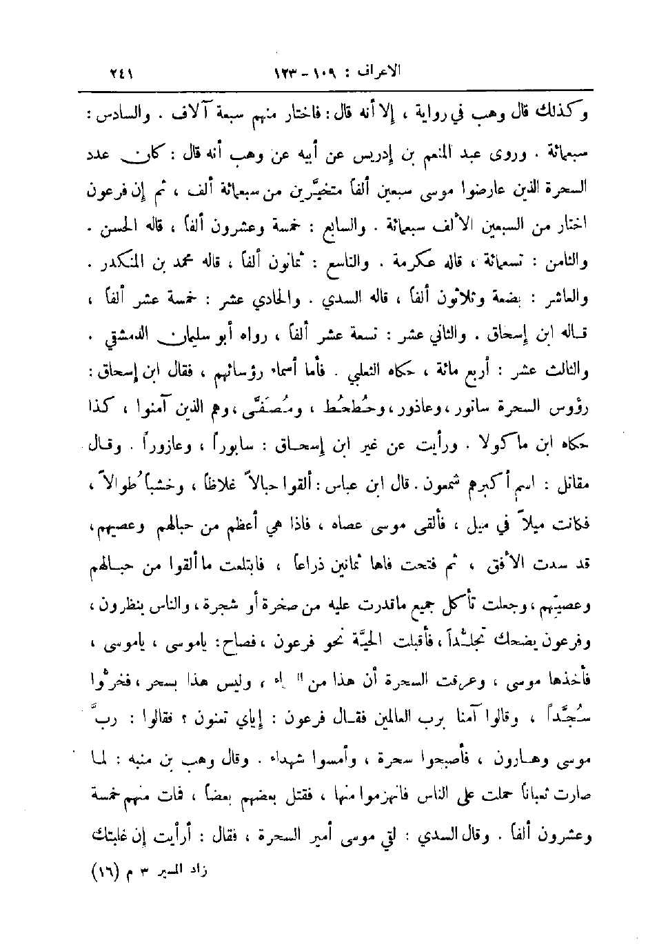 وكذلك قال وهب في رواية ألا أنه قال فاختار منهم سبعة آلاف والسادس سبعمائة وروى عبد المنعم بن إدريس عن ابيه عن وهب أنه قال كان عدد السحرة الذين عارضوا موسى سبعين ألفا متخيرين من سبعمائة ألف ثم إن فرعون اختار من السبعين الألف سبعمائة ولاسابع خمسة وعشرون ألفا قاله الحسن والثامن تسعمائة قاله عكرمة والتاسع ثمانون ألفا قاله محمد بن المنكدر والعاشر بضعة وثلاثون ألفا قاله السدي والحادي عشر خمسة عشر ألفا قاله اب اسحاق والثاني عشر تسعة عشر ألفا رواه أبو سليمان الدمشقي والثالث عشر أربع مائة حكاه الثعلبي فأما أسماء رؤسائهم فقال ابن اسحاق رؤوس السحرة سانور وعاذور وحطحط ووصفى وهم الذين آمنوا كذا حكاه ابن ماكولا ورأيت عن غير ابن اسحاق سابورا وعازورا وقال مقاتل اسم أكبرهم شمعون قال ابن عباس ألقوا حبالا غلاظا وخشبا طوالا فكانت ميلا في مثل فألقى موسى عصاه فاذا هي أعظم من حبالهم وعصيهم قد سدت الأفق ثم فتحت فاها ثمانين ذراعا فابتلعت ما ألقوا من حبالهم وعصيهم وجعلت تأكل جميع ما قدرت عليه من صخرة أو شجرة والناس ينظرون وفرعون يضحك تجلدا فأقبلت الحية نحو فرعون فصاح يا موسى يا موسى فأخذها موسى وعرفت السحرة أن هذا من السماء وليس هذا بسحر فخروا سجدا وقالوا آمنا برب العالمين فقال فرعون إياي تمنون فقالوا رب موسى وهارون فأصبحوا سحرة وأمسوا شهداء وقال وهب بن منبه لما صارت ثعبانا حملت على الناس فانهزموا منها فقتل بعضهم بعضا فمات منهم خمسة وعشرون ألفا وقال السدي لقي موسى أمير السحرة فقال أرأيت إن غلبتك