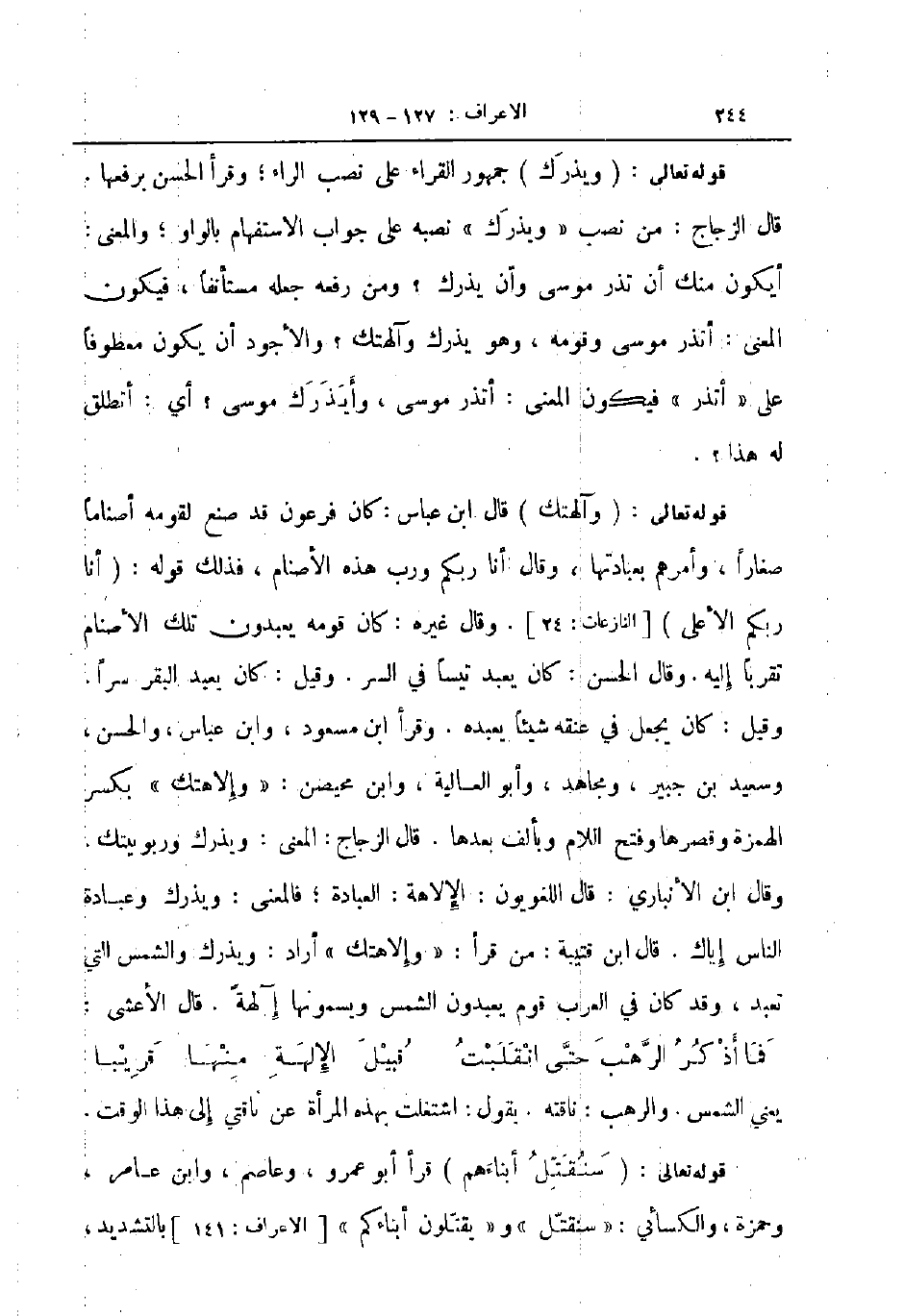 قوله تعالى وآلهتك قال ابن عباس كان فرعون قد صنع لقومه أصناما صغارا وأمرهم بعبادتها وقال أنا ربكم ورب هذه الأصنام فذلك قوله أنا ربكم الأعلى وقال غيره كان قومه يعبدون تلك الأصنام تقربا إليه وقال الحسن كان يعبد تيسا في السر وقيل كان يعبد البقر سرا وقيل كان يجعل في عنقه شيئا يعبده وقرأ ابن مسعود وابن عباس والحسن وسعيد بن جبير ومجاهد وأبو العالية وابن محيصن والإهتك بكسر الهمزة وقصرها وفتح اللام وبألف بعدها قال الزجاج المعنى ويذرك وربوبيتك وقال ابن الانباري قال اللغويون الإلاهة العبادة فالمعنى ويذرك وعبادة الناس إياك قال ابن قتيبة من قرأ وإلاهتك أراد ويذرك والشمس التي تعبد وقد كانف ي العرب قوم يعبدون الشمس ويسمونها آلهة قال الأعشى ... فما أذكر الرهبه حتى انقلبت ... قبيل الإلهة منها قريبا ...