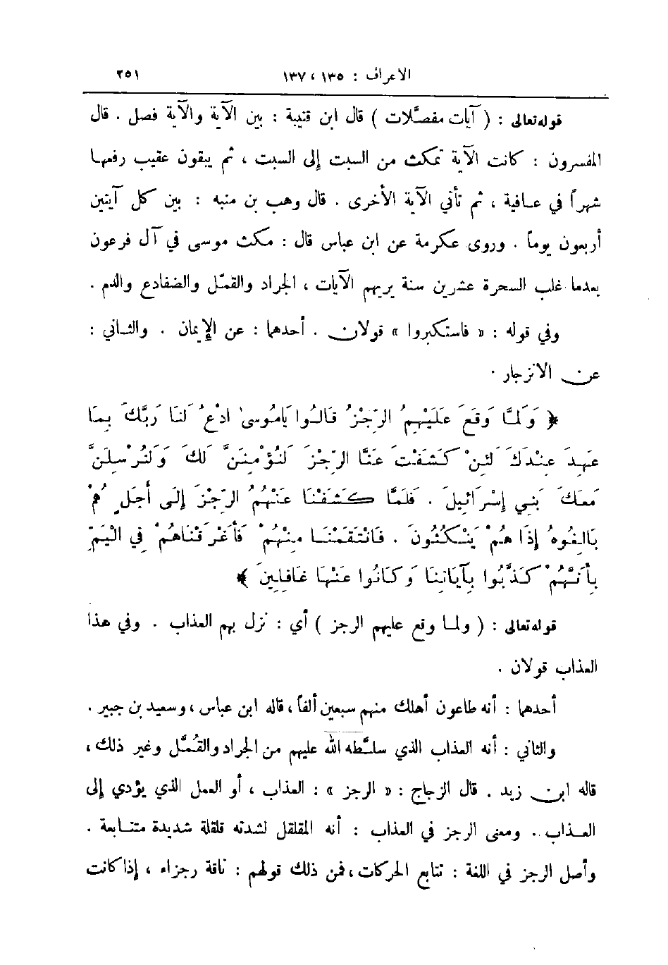 ولما وقع عليهم الرجز قالوا يا موسى ادع لنا ربك بما عهد عندك لئن كشفت عنا الرجز لنؤمنن لك ولنرسلن معك بني إسرائيل فلما كشفنا عنهم الرجز إلى أجل هم بالغوه إذا هم ينكثون فانتقمنا منهم فأغرقناهم في اليم بأنهم كذبوا بآياتنا وكانوا عنها غافلين