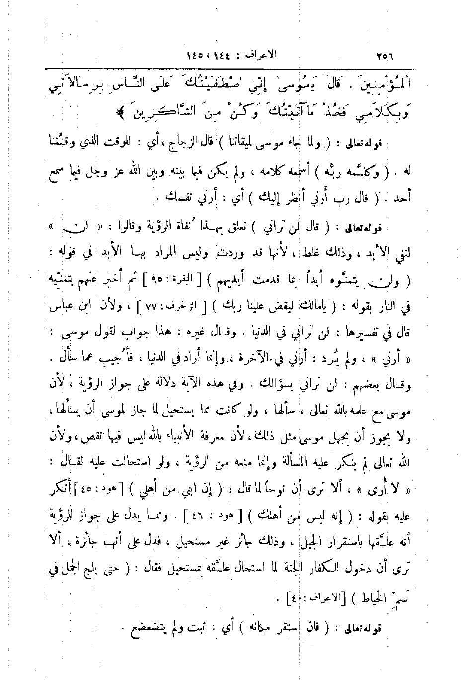 قوله تعالى قال لن تراني تعلق بهذا نفاة الرؤية وقالوا لن لنفي الأبد وذلك غلط لأنها قد وردت وليس المراد بها الأبد في قوله ولن يتمنوه أبدا بما قدمت أيديهم ثم أخبر عنهم بتمنيه في النار بقوله يا مالك ليقض علينا ربك ولأن ابن عباس قال في تفسيرها لن تراني في الدنيا وقال غيره هذا جواب لقول موسى أرني ولم يرد أرني في الآخرة وإنما أراد في الدنيا فأجيب عما سأل وقال بعضهم لن تراني بسؤالك وفي هذه الآية دلالة على جواز الرؤية لأن موسى مع علمه بالله تعالى سألها ولو كانت مما يستحيل لما جاز لموسى أن يسألها ولا يجوز أن يجهل موسى مثل ذلك لأن معرفة الأنبياء بالله ليس فيها نقص ولأن الله تعالى لم ينكر عليه المسألة وإنما منعه من الرؤية ولو استحالت عليه لقال لا أرى ألا ترى أن نوحا لما قال إن ابني من أهلي أنكر عليه بقوله إنه ليس من أهلك ومما يدل على جواز الرؤية أنه علقها باستقرار الجبل وذلك جائز غير مستحيل فدل على أنها جائزة ألا ترى أن دخول الكفار الجنة لما استحال علقه بمستحيل فقال حتى يلج الجمل في سم الخياط