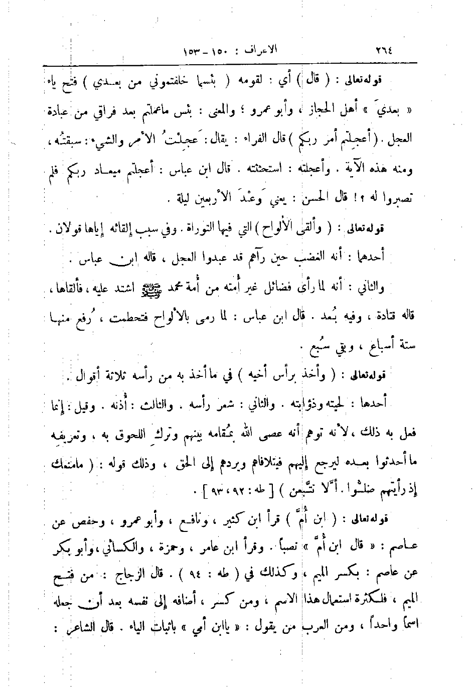 قوله تعالى ابن أم قرأ ابن كثير ونافع وأبو عمرو وحفص عن عاصم قال ابن أم نصبا وقرأ ابن عامر وحمزة والكسائي وأبو بكر عن عاصم بكسر الميم وكذلك في طه قال الزجاج من فتح الميم فلكثرة استعمال هذا الاسم ومن كسر أضافه إلى نفسه بعد أن جعله اسما واحدا ومن العرب من يقول يا ابن أمي باثبات الياء قال الشاعر