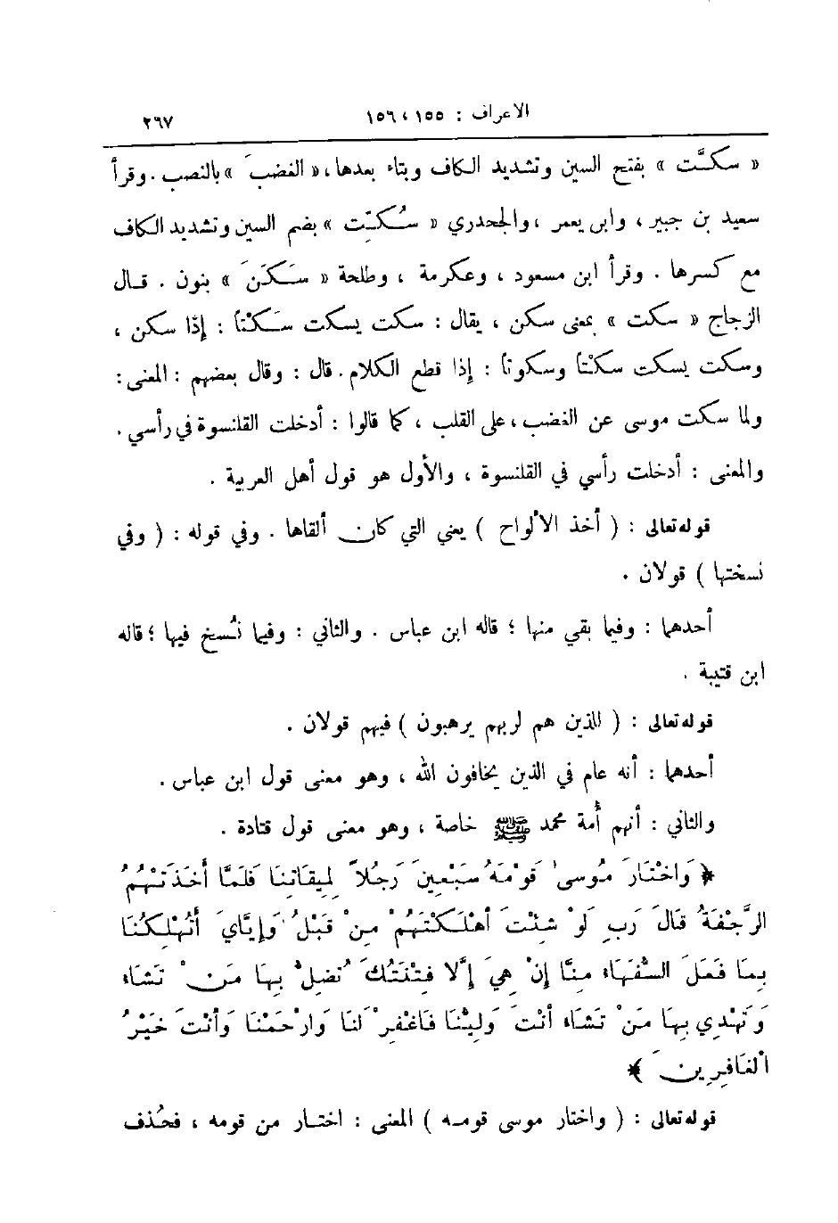 واختار موسى قومه سبعين رجلا لميقاتنا فلما أخذتهم الرجفة قال رب لو شئت أهلكتهم من قبل وإياي أتهلكنا بما فعل السفهاء منا إن هي إلا فتنتك تضل بها من تشاء وتهدي بها من تشاء أنت ولينا فاغفر لنا وارحمنا وأنت خير الغافرين