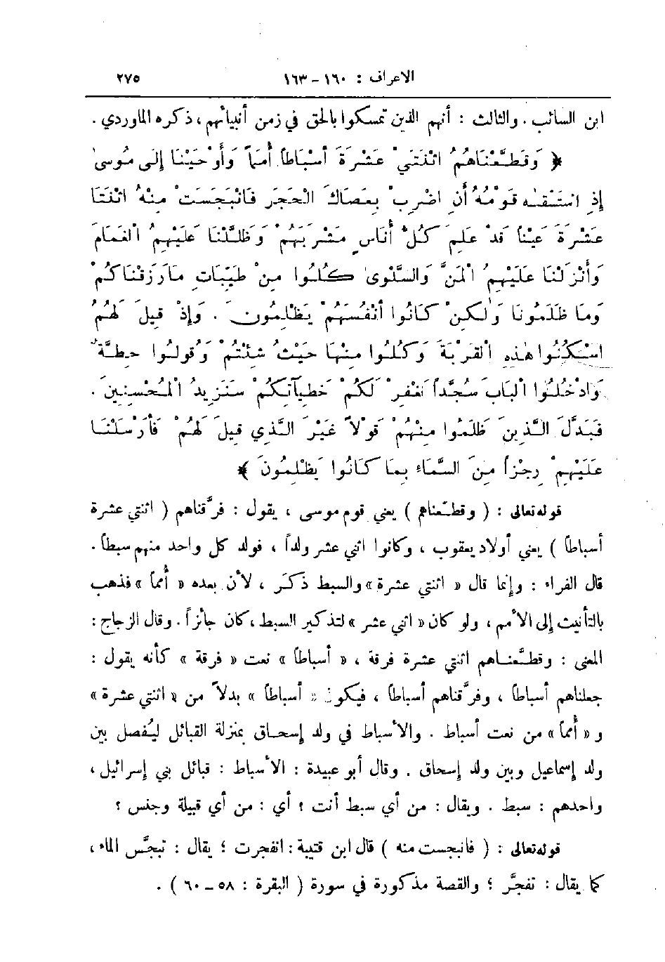 قوله تعالى وقطعناهم يعني قوم موسى يقول فرقناهم اثنتي عشرة أسباطا يعني أولاد يعقوب وكانوا اثنى عشر ولدا فولد كل واحد منهم سبطا قال الفراء وإنما قال اثنتي عشرة والسبط ذكر لأن بعده أمما فذهب بالتأنيث إلى الأمم ولو كان اثني عشر لتذكير السبط كان جائزا وقال الزجاج المعنى وقطعناهم اثنتي عشرة فرقة أسباطا نعت فرقة كأنه يقول جعلناهم أسباطا وفرقناهم أسباطا فيكون أسباطا بدلا من اثنتي عشرة وأمما من نعت أسباط والأسباط في ولد إسحاق بمنزلة القبائل ليفصل بين ولد إسماعيل وبين ولد إسحاق وقال أبو عبيدة الأسباط قبائل بني إسرائيل واحدهم سبط ويقال من أي سبط أنت أي من أي قبيلة وجنس
