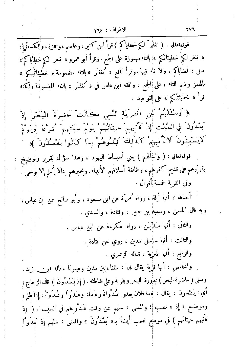 والخامس أنها قرية يقال لها مقنا بين مدين وعينونا قاله ابن زيد ومعنى حاضرة البحر مجاورة البحر وبقربه وعلى شاطئه إذ يعدون قال الزجاج أي يظلمون يقال عدا فلان يعدو عدوانا وعداء وعدوا وعدوا إذا ظلم وموضع إذ نصب والمعنى سلهم عن وقت عدوهم في السبت إذ تأتيهم حيتانهم في موضع نصب أيضا ب يعدون والمعنى سلهم إذ عدوا