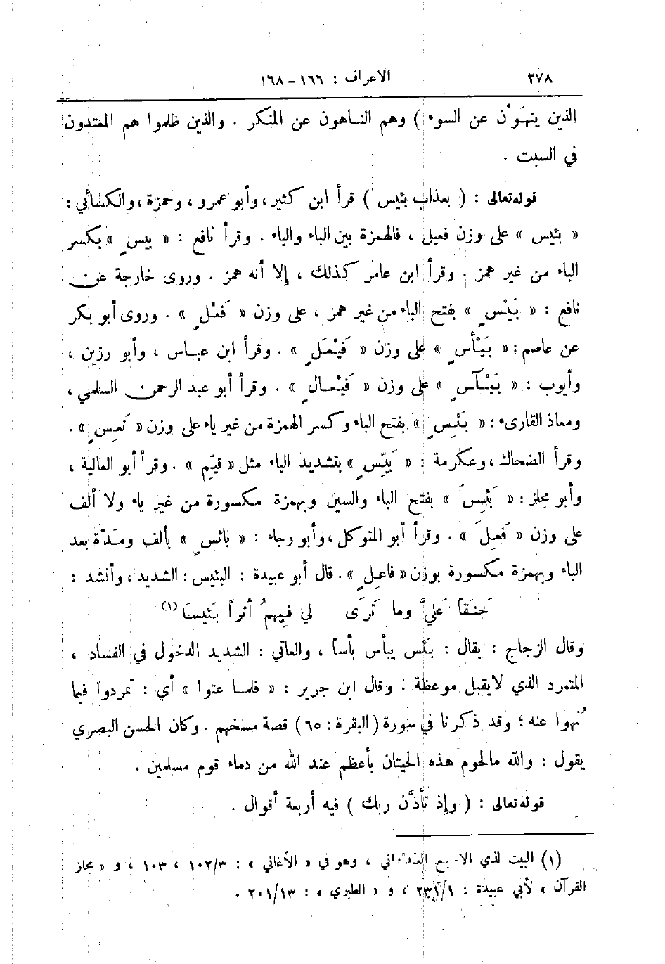قوله تعالى بعذاب بئيس قرأ ابن كثير وأبو عمرو وحمزة والكسائي بئيس على وزن فعيل فالهمزة بين الباء والياء وقرأ نافع بيس بكسر الباء من غير همز وقرأ ابن عامر كذلك إلا أنه همز وروى خارجة عن نافع بيس بفتح الباء من غير همز على وزن فعل وروى أبو بكر عن عاصم بيأس على وزن فيعل وقرأ ابن عباس وأبو رزين وأيوب بيآس على وزن فيعال وقرأ أبو عبد الرحمن السلمي ومعاذ القارئ بئس بفتح الباء وكسر الهمزة من غير ياء على وزن نعس وقرأ الضحاك وعكرمة بيس بتشديد الياء مثل قيم وقرأ أبو العالية وأبو مجلز بئس بفتح الباء والسين وبهمزة مكسورة من غير ياء ولا ألف على وزن فعل وقرأ أبو المتوكل وأبو رجاء بائس بألف ومدة بعد الباء وبهمزة مكسورة بوزن فاعل قال أبو عبيدة البئيس الشديد وأنشد ... حنقا علي وما ترى ... لي فيهم أثرا بئيسا ...