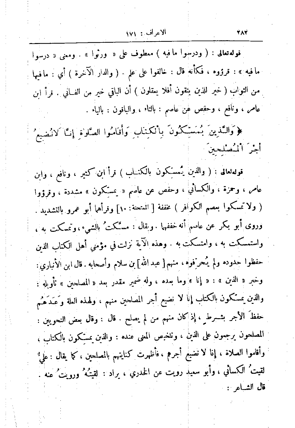 قوله تعالى والذين يمسكون بالكتاب قرأ ابن كثير ونافع وابن عامر وحمزة والكسائي وحفص عن عاصم يمسكون مشددة وقرؤوا ولا تمسكوا بعصم الكوافر مخففة وقرأهما أبو عمرو بالتشديد وروى أبو بكر عن عاصم أنه خففهما ويقال مسكت بالشيء وتمسكت به واستمسكت به وامتسكت به وهذه الآية نزلت في مؤمني اهل الكتاب الذين حفظوا حدوده ولم يحرفوه منهم عبد الله بن سلام واصحابه قال ابن الانباري وخبر الذين إنا وما بعده وله ضمير مقدر بعد المصلحين تأويله والذين يمسكون بالكتاب أنا لا نضيع أجر المصلحين منهم ولهذه العلة وعدهم حفظ الأجر بشرط إذ كان منهم من لم يصلح قال وقال بعض النحويين المصلحون يرجعون على الذين وتلخيص المعنى عنده والذين يمسكون بالكتاب وأقاموا الصلاة إنا لا نضيع أجرهم فأظهرت كنايتهم بالمصلحين كما يقال علي لقيت الكسائي وأبو سعيد رويت عن الخدري يراد لقيته ورويت عنه قال الشاعر