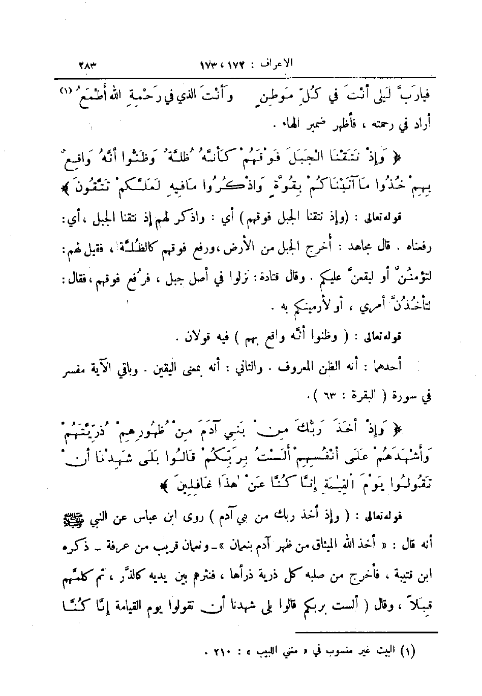 قوله وإذ أخذ ربك من بني آدم روى ابن عباس عن النبي صلى الله عليه و سلم أنه قال أخذ الله الميثاق من ظهر آدم بنعمان ونعمان قريب من عرفة ذكره ابن قتيبة فأخرج من صلبه كل ذرية ذرأها فنثرهم بين يديه كالذر ثم كلمهم قبلا وقال ألست بربكم قالوا بلى شهدنا أن تقولوا يوم القيامة إنا كنا