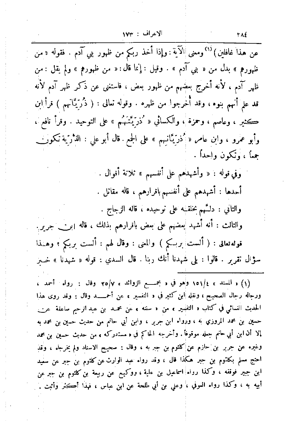 عن هذا غافلين ومعنى الآية وإذا أخذ ربكم من ظهور بني آدم فقوله من ظهورهم بدل من بني آدم وقيل إنما قال من ظهورهم ولم يقل من ظهر آدم لأنه أخرج بعضهم من ظهور بعض فاستغنى عن ذكر ظهر آدم لأنه قد علم أنهم بنوه وقد أخرجوا من ظهره وقوله تعالى ذرياتهم قرأ ابن كثير وعاصم وحمزة والكسائي ذريتهم على التوحيد وقرأ نافع وأبو عمرو وابن عامر ذرياتهم على الجمع قال أبو علي الذرية تكون جمعا وتكون واحدا