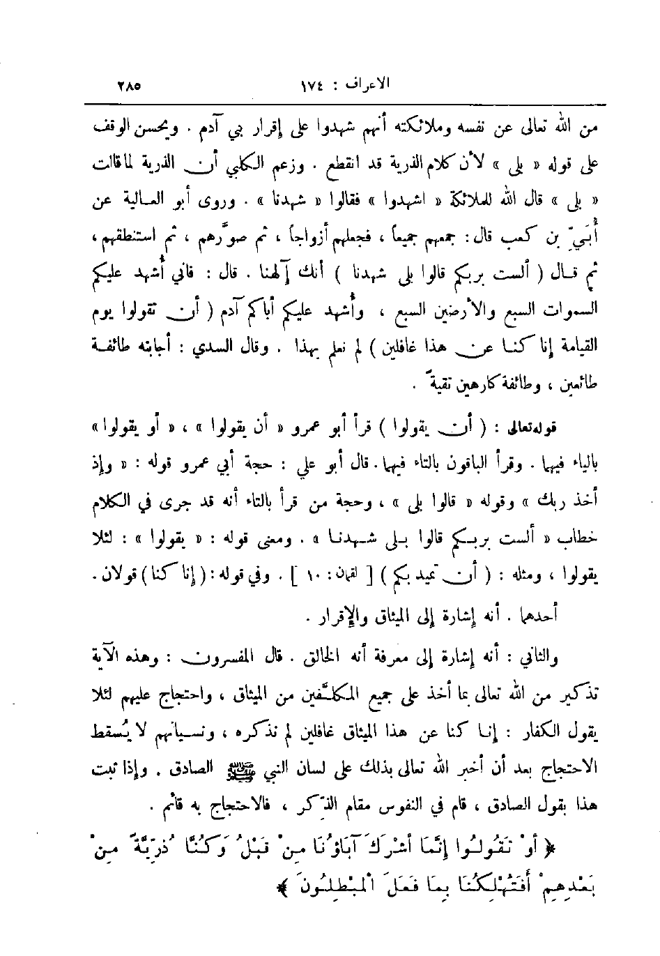 قوله تعالى ان يقولوا قرأ أبو عمرو أن يقولوا أو يقولوا بالياء فيهما وقرأ الباقون بالتاء فيهما قال أبو علي حجة أبي عمرو قوله وإذ أخذ ربك وقوله قالوا بلى وحجة من قرأ بالتاء أنه قد جرى في الكلام خطاب ألست بربكم قالوا بلى شهدنا ومعنى قوله يقولوا لئلا يقولوا مثله أن تميد بكم وفي قوله إنا كنا قولان