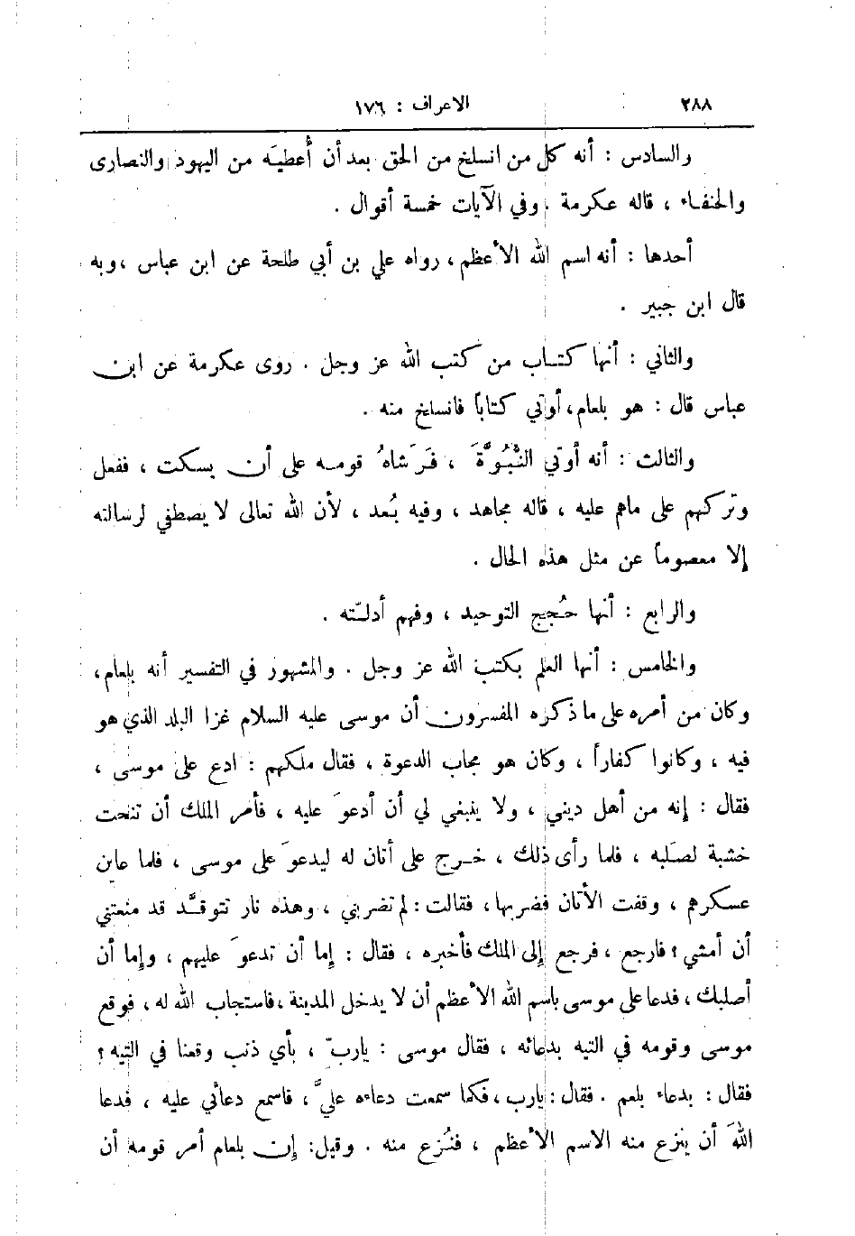 والخامس أنها العلم بكتب الله عز و جل والمشهور في التفسير أنه بلعام وكان من أمره على ما ذكره المفسرون أن موسى عليه السلام غزا البلد الذي هو فيه وكانوا كفارا وكان هو مجاب الدعوة فقال ملكهم ادع على موسى فقال إنه من أهل ديني ولا ينبغي لي أن أدعو عليه فأمر الملك أن تنحت خشبة لصلبه فلما رأى ذلك خرج على أتان له ليدعو على موسى فلما عاين عسكرهم وقفت الأتان فضربها فقالت لم تضربني وهذه نار تتوقد قد منعتني أن أمشي فارجع فرجع إلى الملك فأخبره فقال إما أن تدعو عليهم وإما أن أصلبك فدعا على موسى باسم الله الأعظم أن لا يدخل المدينة فاستجاب الله له فوقع موسى وقومه في التيه بدعائه فقال موسى يا رب بأي ذنب وقعنا في التيه فقال بدعاء بلعم فقال يا رب فكما سمعت دعاءه علي فاسمع دعائي عليه فدعا الله أن ينزع منه الاسم الأعظم فنزع منه وقيل إن بلعام أمر قومه أن