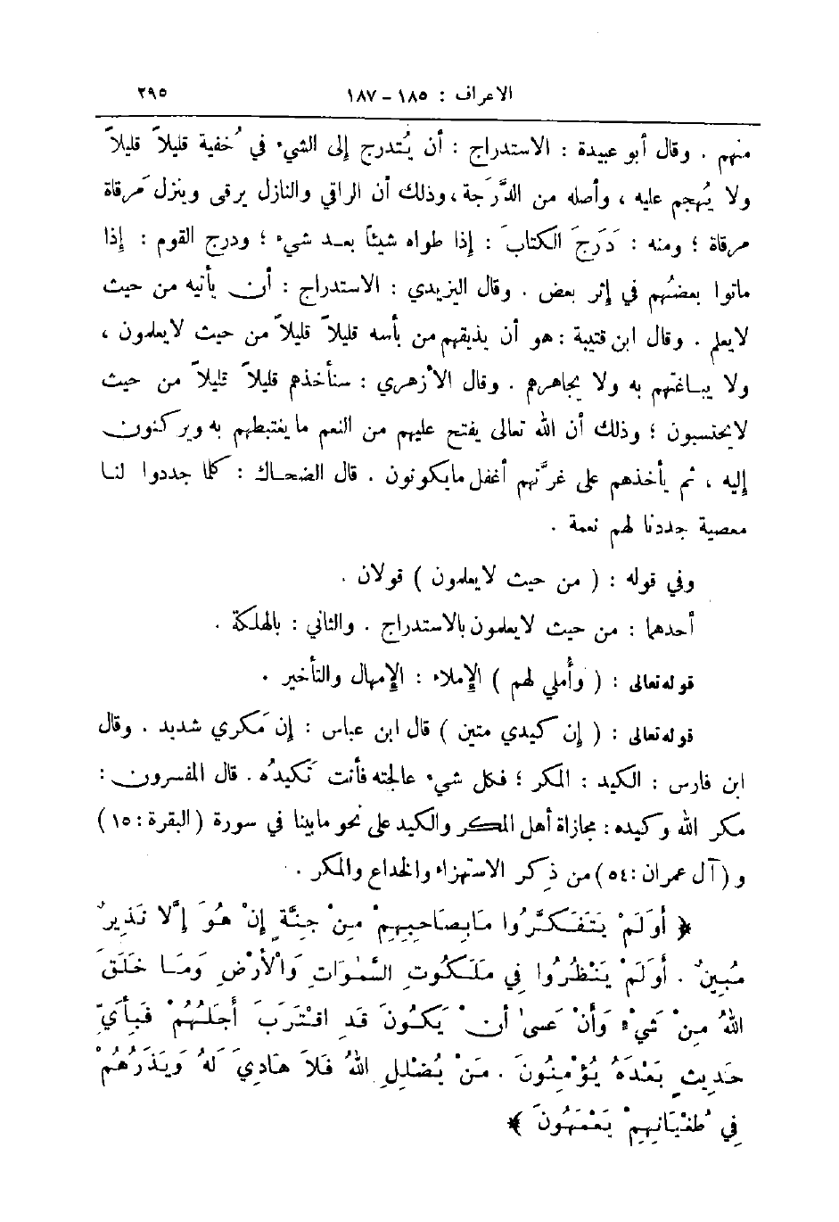منهم وقال أبو عبيدة الاستدراج أن يتدرج إلى الشيء في خفية قليلا قليلا ولا يهجم عليه وأصله من الدرجة وذلك أن الراقي والنازل يرقى وينزل مرقاة مرقاة ومنه درج الكتاب إذا طواه شيئا بعد شيء ودرج القوم إذا ماتوا بعضهم في أثر بعض وقال اليزيدي الاستدراج أن يأتيه من حيث لا يعلم وقال ابن قتيبة هو ان يذيقهم من بأسه قليلا قليلا من حيث لا يعلمون ولا يباغتهم به ولا يجاهرهم وقال الأزهري سنأخذهم قليلا قليلا من حيث لا يحتسبون وذلك أن الله تعالى يفتح عليهم من النعم ما يغتبطهم به ويركنون إليه ثم يأخذهم على غرتهم أغفل ما يكونون قال الضحاك كلما جددوا لنا معصية جددنا لهم نعمة