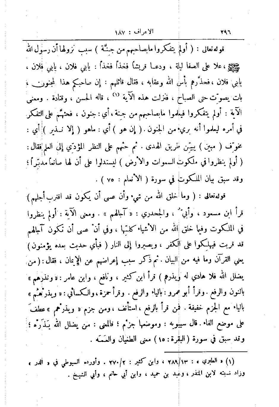 قوله تعالى أولم يتفكروا ما بصاحبهم من جنة سبب نزولها أن رسول الله صلى الله عليه و سلم علا على الصفا ليلة ودعا قريشا فخذا فخذا يا بني فلان يا بني فلان يا بني فلان فحذرهم بأس الله وعقابه فقال قائلهم إن صاحبكم هذا لمجنون بات يصوت حتى الصباح فنزلت هذه الآية قاله الحسن وقتادة ومعنى الآية أولم يتفكروا فيعلموا ما بصاحبهم من جنة أي جنون فحثهم على التفكر في أمره ليعلموا أنه بريء من الجنون إن هو أي ما هو إلا نذير أي مخوف مبين يبين طريق الهدى ثم حثهم على النظر المؤدي إلى العلم فقال أولم ينظروا في ملكوت السموات والأرض ليستدلوا على أن لها صانعا مدبرا وقد سبق بيان الملكوت في سورة الأنعام