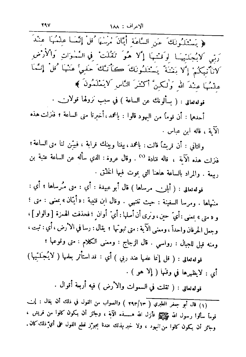 يسئلونك عن الساعة أيان مرساها قل إنما علمها عند ربي لا يجليها لوقتها إلا هو ثقلت في السموات والأرض لا تأتيكم إلا بغتة يسئلونك كأنك حفي عنها قل إنما علمها عند الله ولكن أكثر الناس لا يعلمون