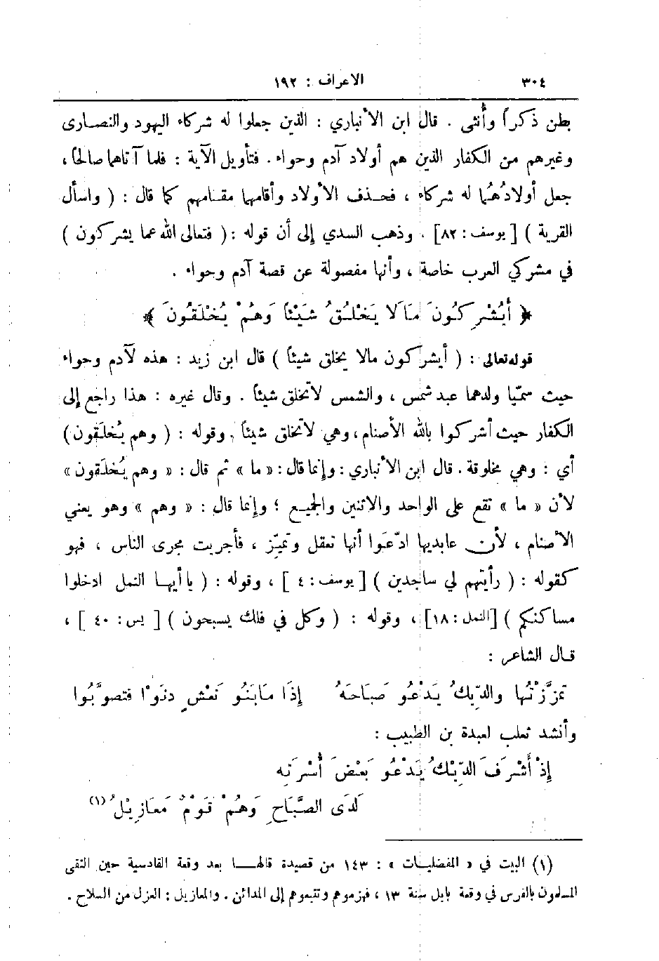 قوله تعالى أيشركون مالا يخلق شيئا قال ابن زيد هذه لآدم وحواء حيث سميا ولدهما عبد شمس والشمس لا تخلق شيئا وقال غيره هذا راجع إلى الكفار حيث أشركوا بالله الاصنام وهي لا تخلق شيئا وقوله وهم يخلقون أي وهي مخلوقة قال ابن الانباري وإنما قال ما ثم قال وهم يخلقون لأن ما تقع على الواحد والاثنين والجميع وإنما قال وهم وهو يعني الأصنام لأن عابديها أدعوا أنها تعقل وتميز فأجريت مجرى الناس فهو كقوله رأيتهم لي ساجدين وقوله يا أيها النمل ادخلوا مساكنكم وقوله وكل في فلك يسبحون قال الشاعر ... تمززتها والديك يدعو صباحه ... إذا ما بنو نعش دنوا فتصوبوا ...