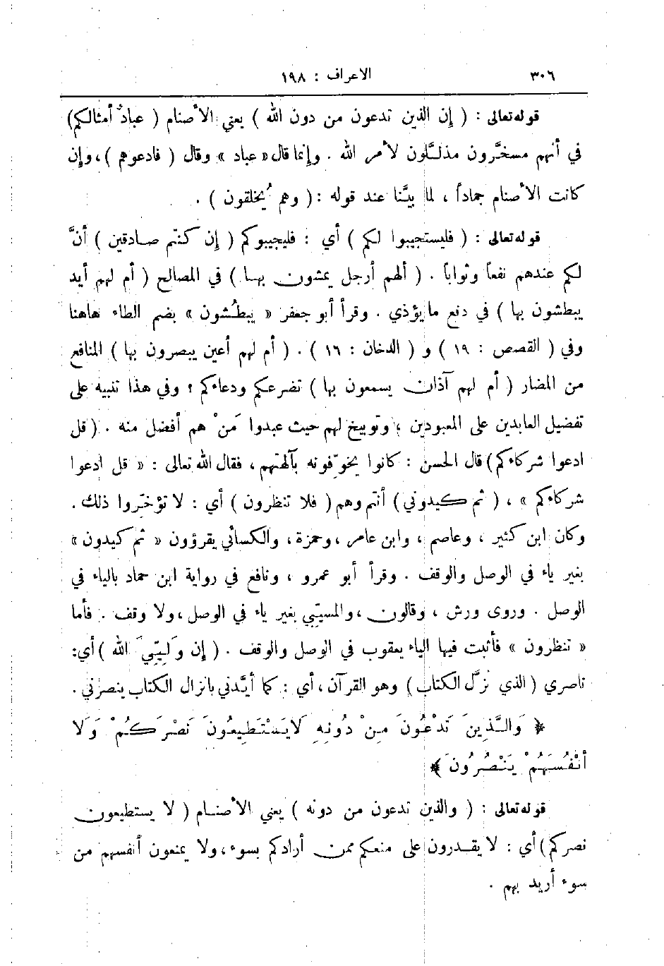 قوله تعالى فليستجيبوا لكم أي فليجيبوكم إن كنتم صادقين أن لكن عندهم نفعا وثوابا ألهم أرجل يمشون بها في المصالح أم لهم أيد يبطشون بها في دفع ما يؤذي وقرأ أبو جعفر يبطشون بضم الطاء هاهنا وفي القصص والدخان أم لهم أعين يبصرون بها المنافع من المضار أم لهم آذان يسمعون بها تضرعكم ودعاءكم وفي هذا تنبيه على تفضيل العابدين على المعبودين وتوبيخ لهم حيث عبدوا من هم أفضل منه قل ادعوا شركاءكم قال الحسن كانوا يخوفونه بآلهتهم فقال الله تعالى قل ادعوا شركاءكم ثم كيدوني أنتم وهم فلا تنظرون أي لا تؤخروا ذلك وكان ابن كثير وعاصم وابن عامر وحمزة والكسائي يقرؤون ثم كيدون بغير ياء في الوصل والوقف وقرأ أبو عمرو ونافع في رواية ابن حماد بالياء في الوصل وروى ورش وقالون والمسيبي بغير ياء في الوصل ولا وقف فأما تنظرون فأثبت فيها الياء يعقوب في الوصل والوقف إن وليي الله أي ناصري الذي نزل الكتاب وهو القرآن أي كما أيدني بانزال الكتاب ينصرني
