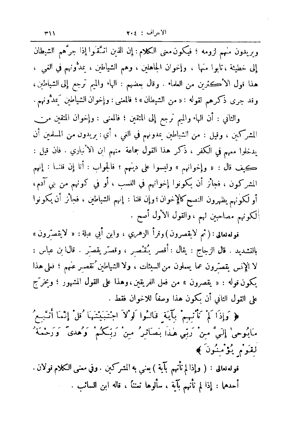 قوله تعالى ثم لا يقصرون وقرأ الزهري وابن أبي عبلة لا يقصرون بالتشديد قال الزجاج يقال أقصر يقصر وقصر يقصر قال ابن عباس لا الإنس يقصرون عما يعملون من السيئات ولا الشياطين تقصر عنهم فعلى هذا يكون قوله يقصرون من فعل الفريقين وهذا على القول المشهور ويخرج على القول الثاني أن يكون هذا وصفا للاخوان فقط