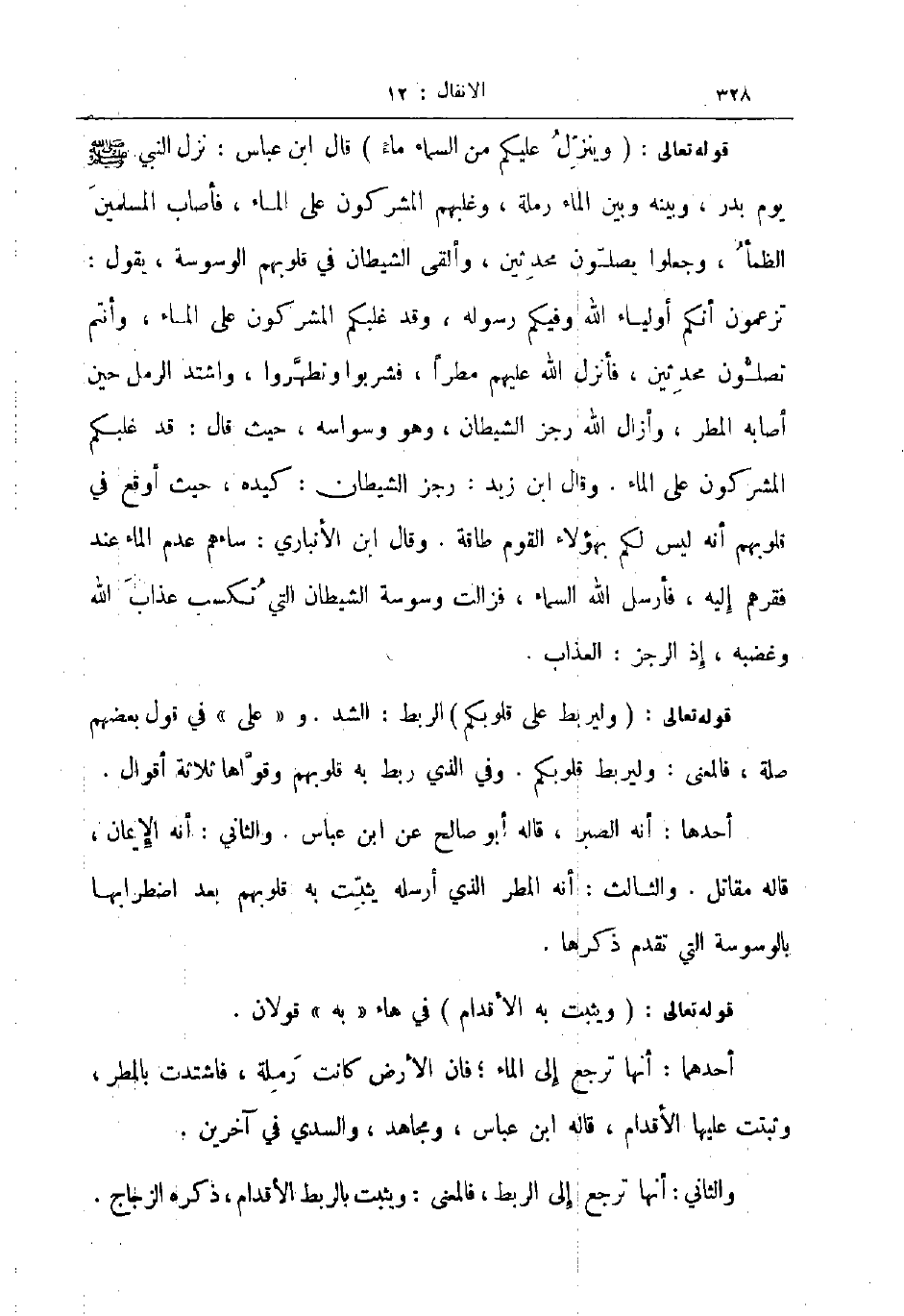 قوله تعالى وينزل عليكم من السماء ماء قال ابن عباس نزل النبي صلى الله عليه و سلم يوم بدر وبينه وبين الماء رملة وغلبهم المشركون على الماء فأصاب المسلمين الظمأ وجعلوا يصلون محدثين وألقى الشيطان في قلوبهم الوسوسة يقول تزعمون أنكم أولياء الله وفيكم رسوله وقد غلبكم المشركون على الماء وأنتم تصلون محدثين فأنزل الله عليهم مطرا فشربوا وتطهروا واشتد الرمل حين اصابه المطر وأزال الله رجز الشيطان وهو وسواسه حيث قال قد غلبكم المشركون على الماء وقال ابن زيد رجز الشيطان كيده حيث أوقع في قلوبهم أنه ليس لكم بهؤلاء القوم طاقة وقال ابن الانباري ساءهم عدم الماء عند فقرهم إليه فأرسل الله السماء فزالت وسوسة الشيطان التي تكسب عذاب الله وغضبه إذ الرجز العذاب