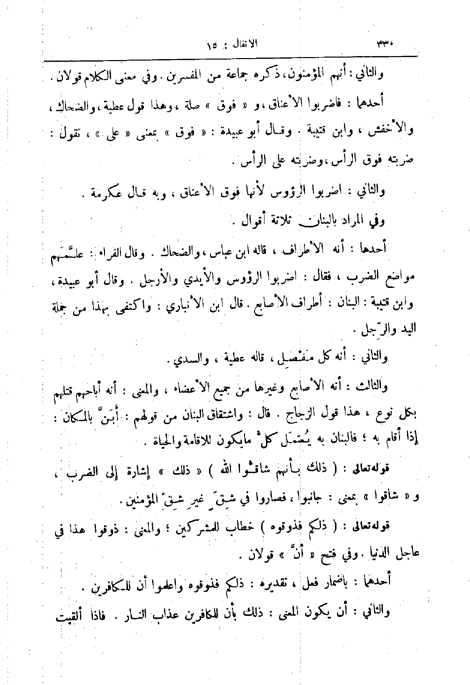 والثالث أنه الأصابع وغيرها من جميع الأعضاء والمعنى أنه أباحهم قتلهم بكل نوع هذا قول الزجاج قال واشتقاق البنان من قولهم أبن بالمكان إذا أقام به فالبنان به يعتمل كل ما يكون للاقامة والحياة