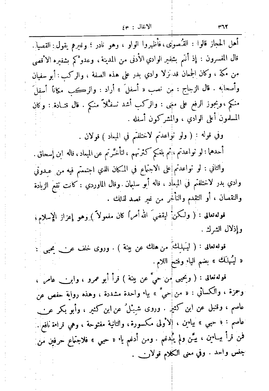 أهل الحجاز قالوا القصوى فأظهروا الواو وهو نادر وغيرهم يقول القصيا قال المفسرون إذ أنتم بشفير الوادي الأدنى من المدينة وعدوكم بشفيره الأقصى من مكة وكان الجمعان قد نزلا وادي بدر على هذه الصفة والركب أبو سفيان وأصحابه قال الزجاج من نصب أسفل اراد والركب مكانا أسفل منكم ويجوز الرفع على المعنى والركب أشد تسفلا منكم قال قتادة وكان المسلمون أعلى الوادي والمشركون أسفله