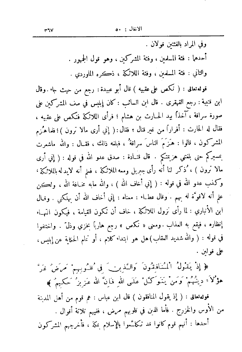قوله تعالى نكص على عقبيه قال أبو عبيدة رجع من حيث جاء وقال ابن قتيبة رجع القهقري قال ابن السائب كان إبليس في صف المشركين على صورة سراقة آخذا بيد الحارث بن هشام فرأى الملائكة فنكص على عقبيه فقال له الحارث أفرارا من غير قتال فقال إني أرى مالا ترون فلما هزم المشركون قالوا هزم الناس سراقة فبلغه ذلك فقال والله ما شعرت بمسيركم حتى بلغتني هزيمتكم قال قتادة صدق عدة الله في قوله إني أرى مالا ترون ذكر لنا أنه رأى جبريل ومعه الملائكة فعلم أنه لا يد له بالملائكة وكذب عدو الله في قوله إني أخاف الله الله ما به مخافة الله ولكن علم أنه لا قوة له بهم وقال عطاء معناه إني أخاف الله أن يهلكني وقال ابن الانباري لما رأى نزول الملائكة خاف أن تكون القيامة فيكون انتهاء إنظاره فيقع به العذاب ومعنى نكص رجع هاربا بخزي وذل واختلفوا في قوله والله شديد العقاب هل هو ابتداء كلام أو تمام الحكاية عن إبليس على قولين