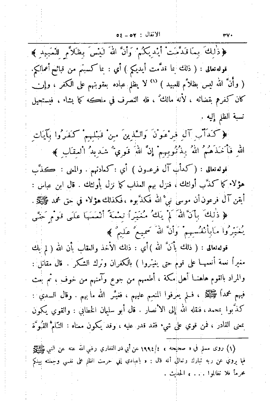 قوله تعالى ذلك بأن الله أي ذلك الأخذ والعقاب بأن الله لم يك مغيرا نعمة أنعمها على قوم حتى يغيروا بالكفران وترك الشكر قال مقاتل والمراد بالقوم هاهنا أهل مكة أطعمهم من جوع وآمنهم من خوف ثم بعث فيهم محمدا صلى الله عليه و سلم فلم يعرفوا المنعم عليهم فغير الله ما بهم وقال السدي كذبوا بمحمد فنقله الله إلى الأنصار قال أبو سليمان الخطابي والقوي يكون بمعنى القادر فمن قوي على شيء فقد قدر عليه وقد يكون معناه التام القوة