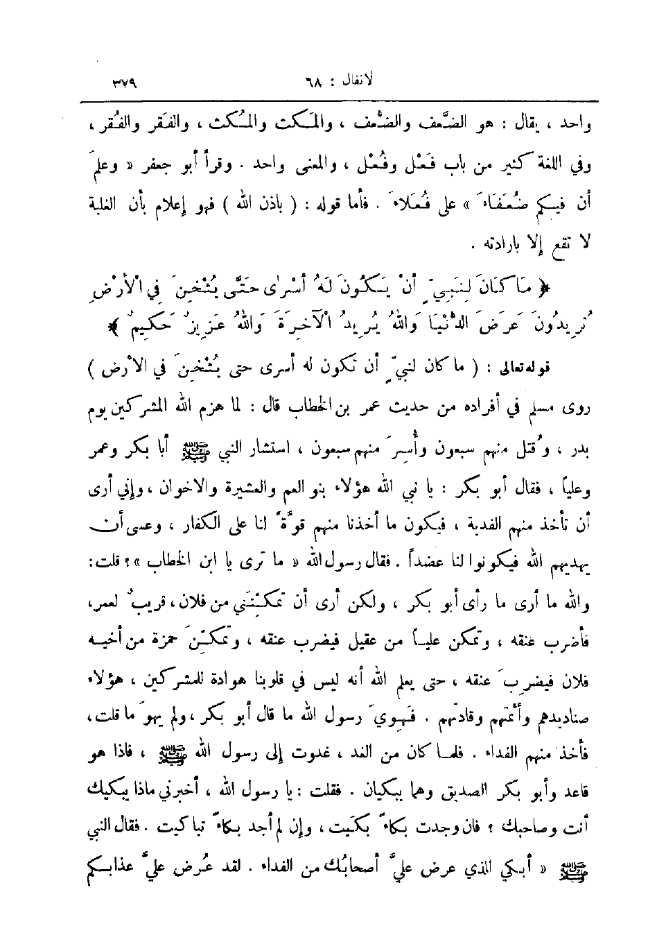 قوله تعالى ما كان لنبي أن تكون له أسرى حتى يثخن في الأرض روى مسلم في افراده من حديث عمر بن الخطاب قال لما هزم الله المشركين يوم بدر وقتل منهم سبعون واسر منهم سبعون استشار النبي صلى الله عليه و سلم أبا بكر وعمر وعليا فقال أبو بكر يا نبي الله هؤلاء بنو العم والعشيرة والاخوان وإني أرى أن تأخذ منهم الفدية فيكون ما أخذنا منهم قوة لنا على الكفار وعسى أن يهديهم الله فيكونوا لنا عضدا فقال رسول الله ما ترى ياابن الخطاب قلت والله ما أرى ما رأى أبو بكر ولكن أرى أن تمكنني من فلان قريب لعمر فأضرب عنقه وتمكن عليا من عقيل فيضرب عنقه وتمكن حمزة من أخيه فلان فيضرب عنقه حتى يعلم الله أنه ليس في قلوبنا هوادة للمشركين هؤلاء صناديدهم وأئمتهم وقادتهم فهوى رسول الله ما قال أبو بكر ولم يهو ما قلت فأخذ منهم الفداء فلما كان من الغد غدوت إلى رسول الله صلى الله عليه و سلم فاذا هو قاعد وأبو بكر الصديق وهما يبكيان فقلت يا رسول الله أخبرني ماذا يبكيك أنت وصاحبك فان وجدت بكاء بكيت وإن لم أجد بكاء تباكيت فقال النبي صلى الله عليه و سلم أبكي للذي عرض علي أصحابك من الفداء لقد عرض علي عذابكم