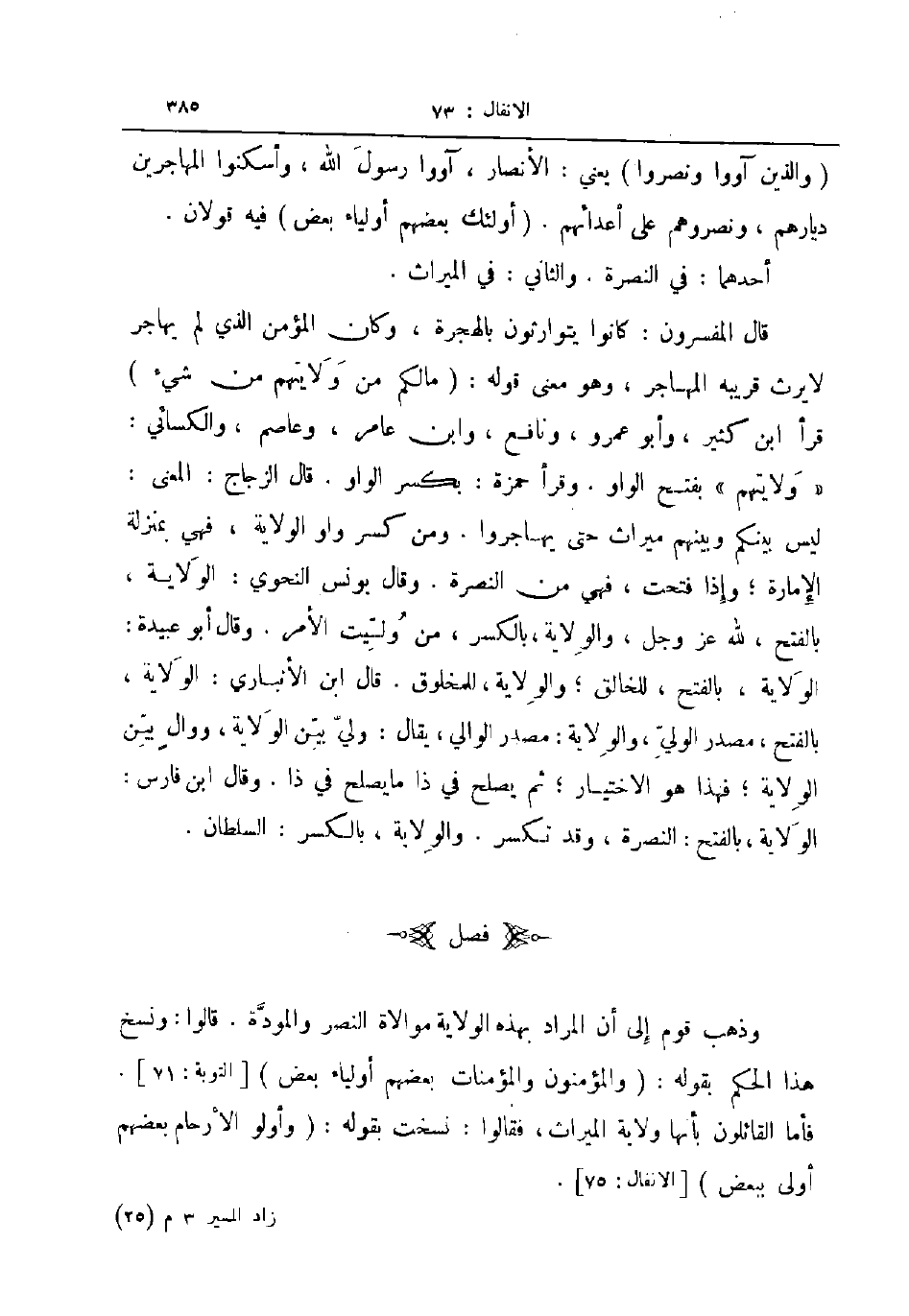 قال المفسرون كانوا يتوارثون بالهجرة وكان المؤمن الذي لم يهاجر لا يرث قريبه المهاجر وهو معنى قوله مالكم من ولايتهم من شيء قرأ ابن كثير وأبو عمرو ونافع وابن عامر وعاصم والكسائي ولايتهم بفتح الواو وقرأ حمزة بكسر الواو قال الزجاج المعنى ليس بينكم وبينهم ميراث حتى يهاجروا ومن كسر واو الولاية فهي بمنزلة الإمارة وإذا فتحت فهي من النصرة وقال يونس النحوي الولاية بالفتح لله عز و جل والولاية بالكسر من وليت الأمر وقال أبو عبيدة الولاية بالفتح للخالق والولاية للمخلوق قال ابن الانباري الولاية بالفتح مصدر الولي والولاية مصدر الوالي يقال ولي بين الولاية ووال بين الولاية فهذا هو الاختيار ثم يصلح في ذا ما يصلح في ذا وقال ابن فارس الولاية بالفتح النصرة وقد تكسر والولاية بالكسر السلطان