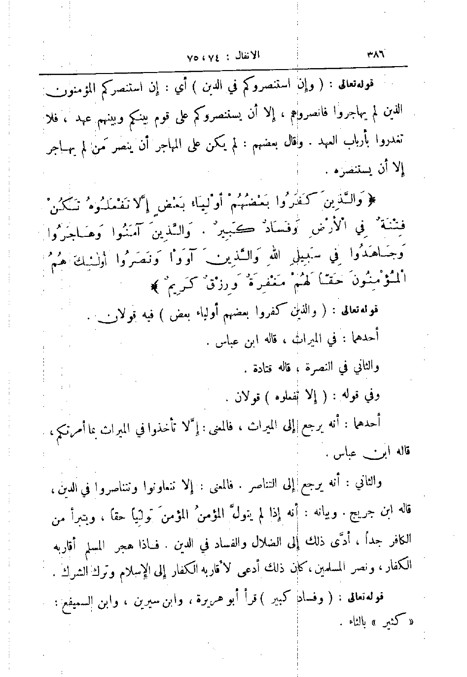 والثاني أنه يرجع إلى التناصر فالمعنى إلا تتعانوا وتتناصروا في الدين قاله ابن جريج وبيانه أنه إذا لم يتول المؤمن المؤمن توليا حقا ويتبرأ من الكافر جدا أدى ذلك إلى الضلال والفساد في الدين فاذا هجر المسلم أقاربه الكفار ونصر المسلمين كان ذلك أدعى لأقاربه الكفار إلى الإسلام وترك الشرك