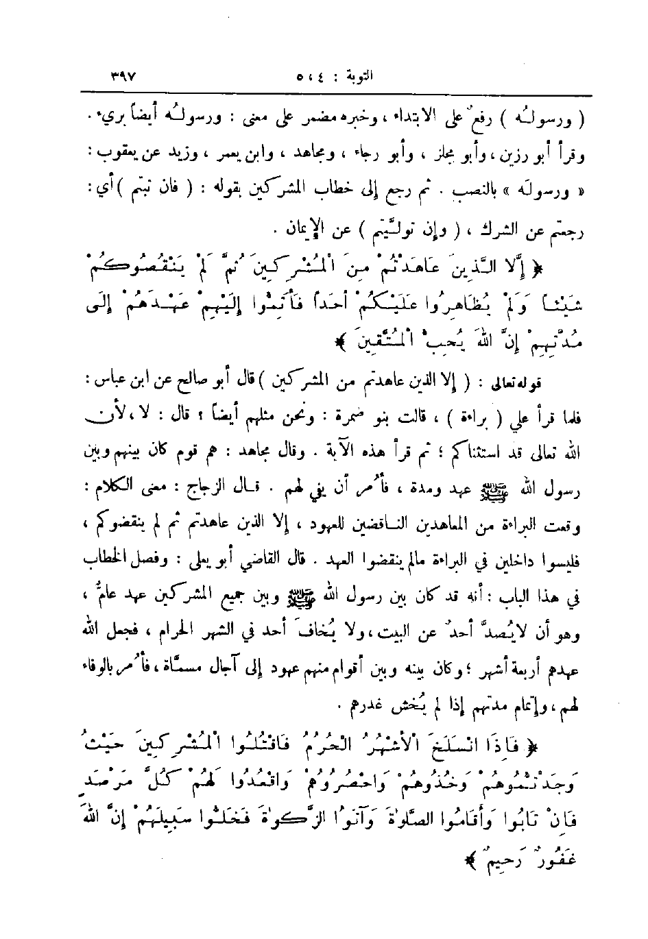 قوله تعالى إلا الذين عاهدتم من المشركين قال أبو صالح عن ابن عباس فلما قرأ علي براءة قالت بنو ضمرة ونحن مثلهم أيضا قال لا لأن الله تعالى قد استثناكم ثم قرأ هذه الآية وقال مجاهد هم قوم كان بينهم وبين رسول الله صلى الله عليه و سلم عهد ومدة فأمر أن يفي لهم قال الزجاج معنى الكلام وقعت البراءة من المعاهدين الناقضين للعهود إلا الذين عاهدتم ثم لم ينقضوكم فليسوا داخلين في البراءة مالم ينقضوا العهد قال القاضي أبو يعلى وفصل الخطاب في هذا الباب أنه قد كان بين رسول الله صلى الله عليه و سلم وبين جميع المشركين عهد عام وهو أن لا يصد أحد عن البيت ولا يخاف أحد في الشهر الحرام فجعل الله عهدهم أربعة اشهر وكان بينه وبين أقوام منهم عهود إلى آجال مسماة فأمر بالوفاء لهم وإتمام مدتهم إذا لم يخش غدرهم