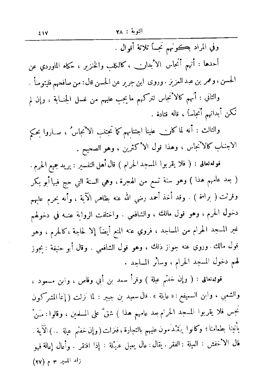وفي المراد بكونهم نجسا ثلاثة أقوال